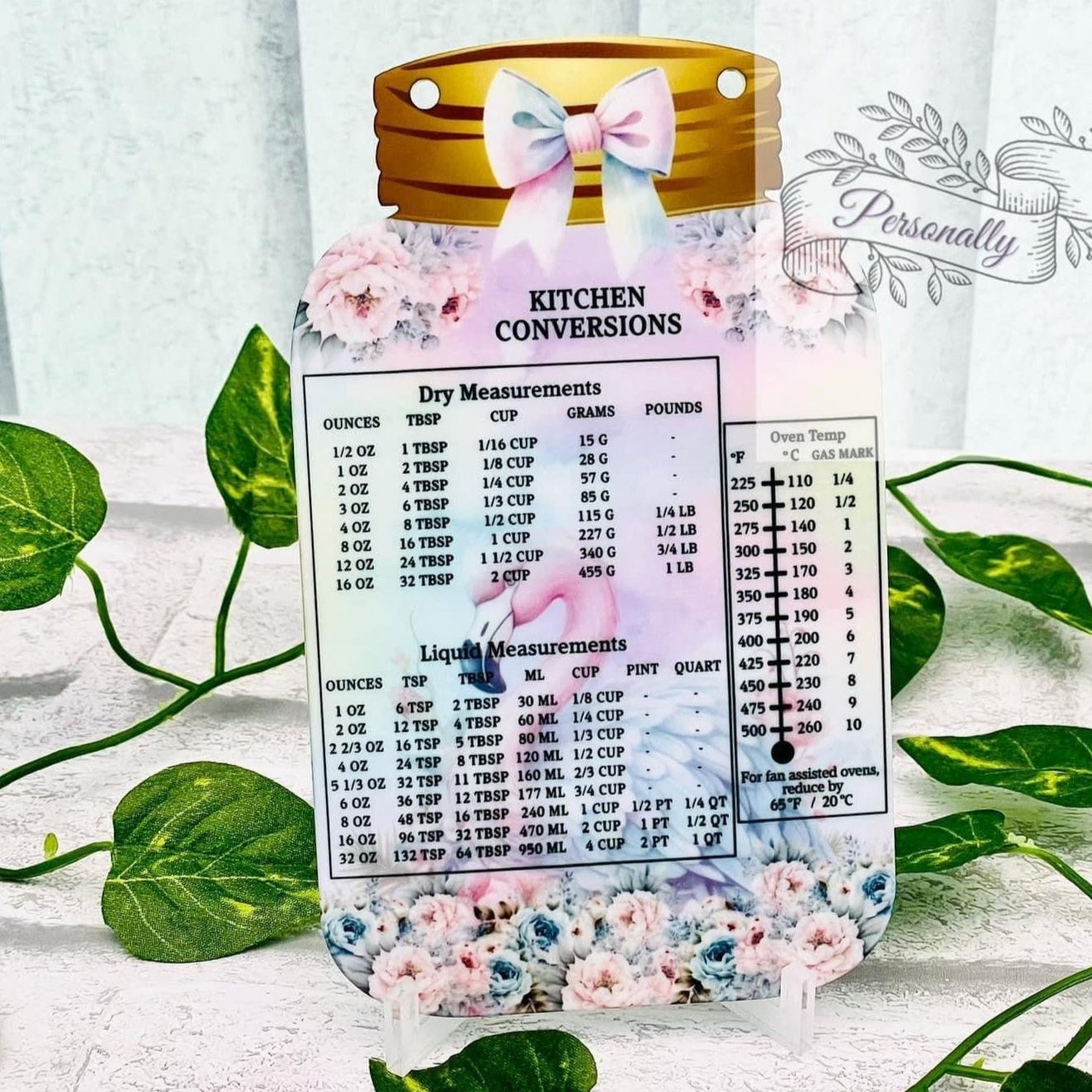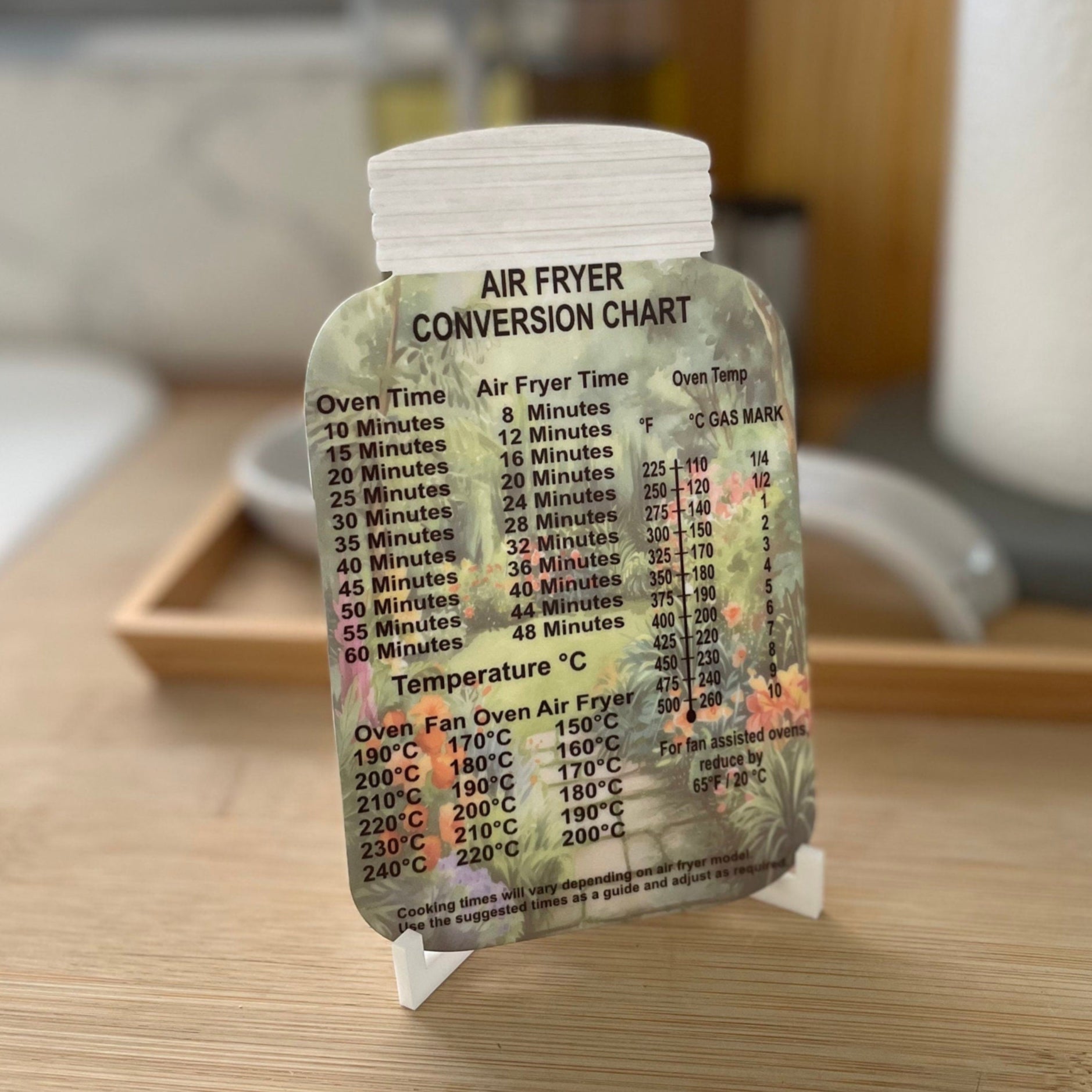 An ideal gift for air fryer enthusiasts, this mason jar-style air fryer conversion plaque comes with either a hanging option or a detachable stand for convenient placement anywhere in your kitchen. It offers quick access to cooking times and temperatures, eliminating the need to search online. Available in various designs, it can be personalized with a name or message on the top lid—or left plain. Please provide personalization details at checkout if desired. Crafted from acrylic and printed with high-resolution ink, it measures 15cm by 9cm and arrives flat-packed to prevent damage. The stand pieces interlock securely to support the plaque.