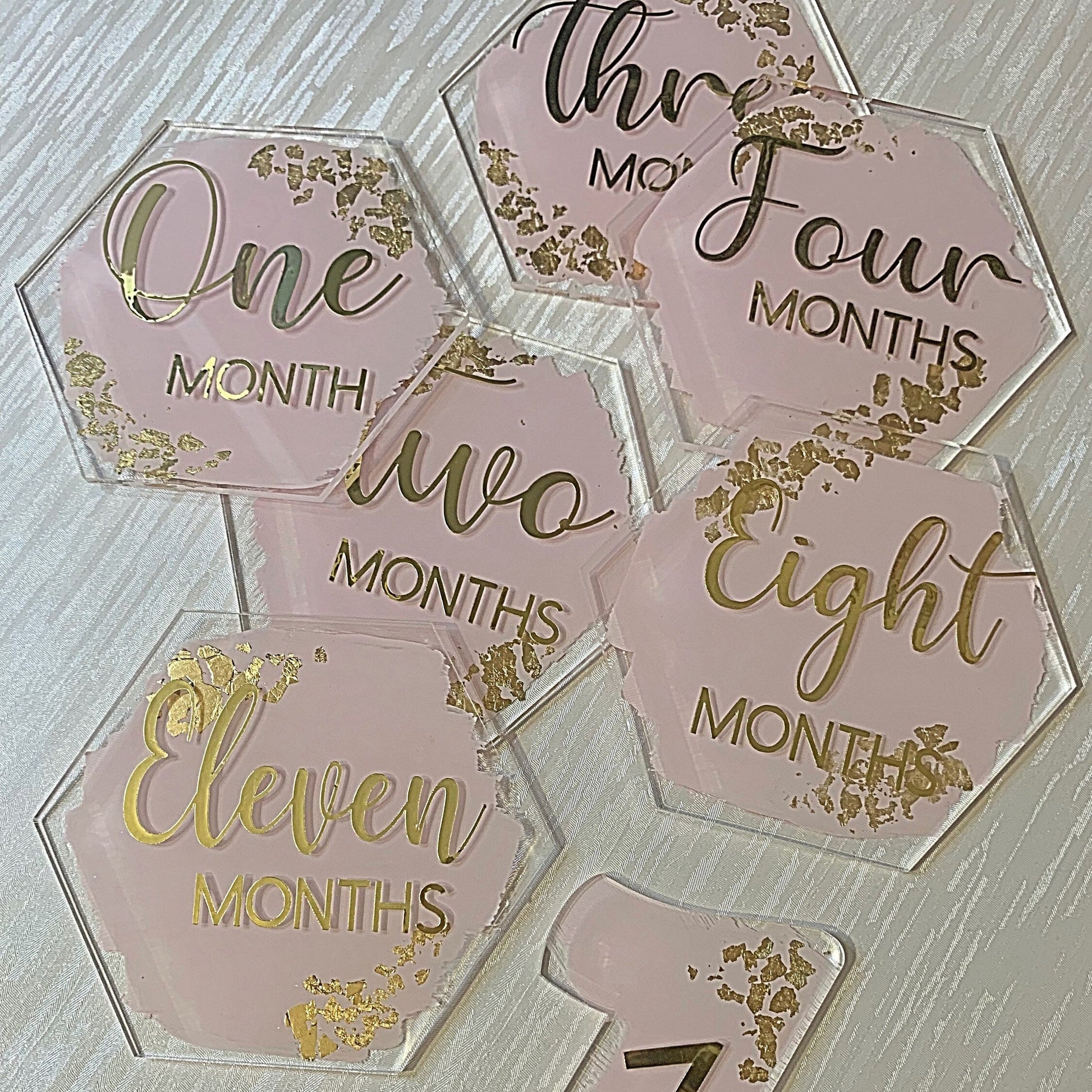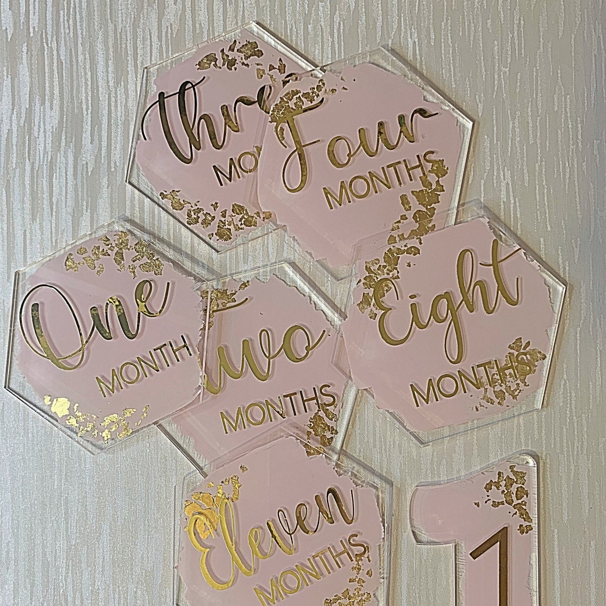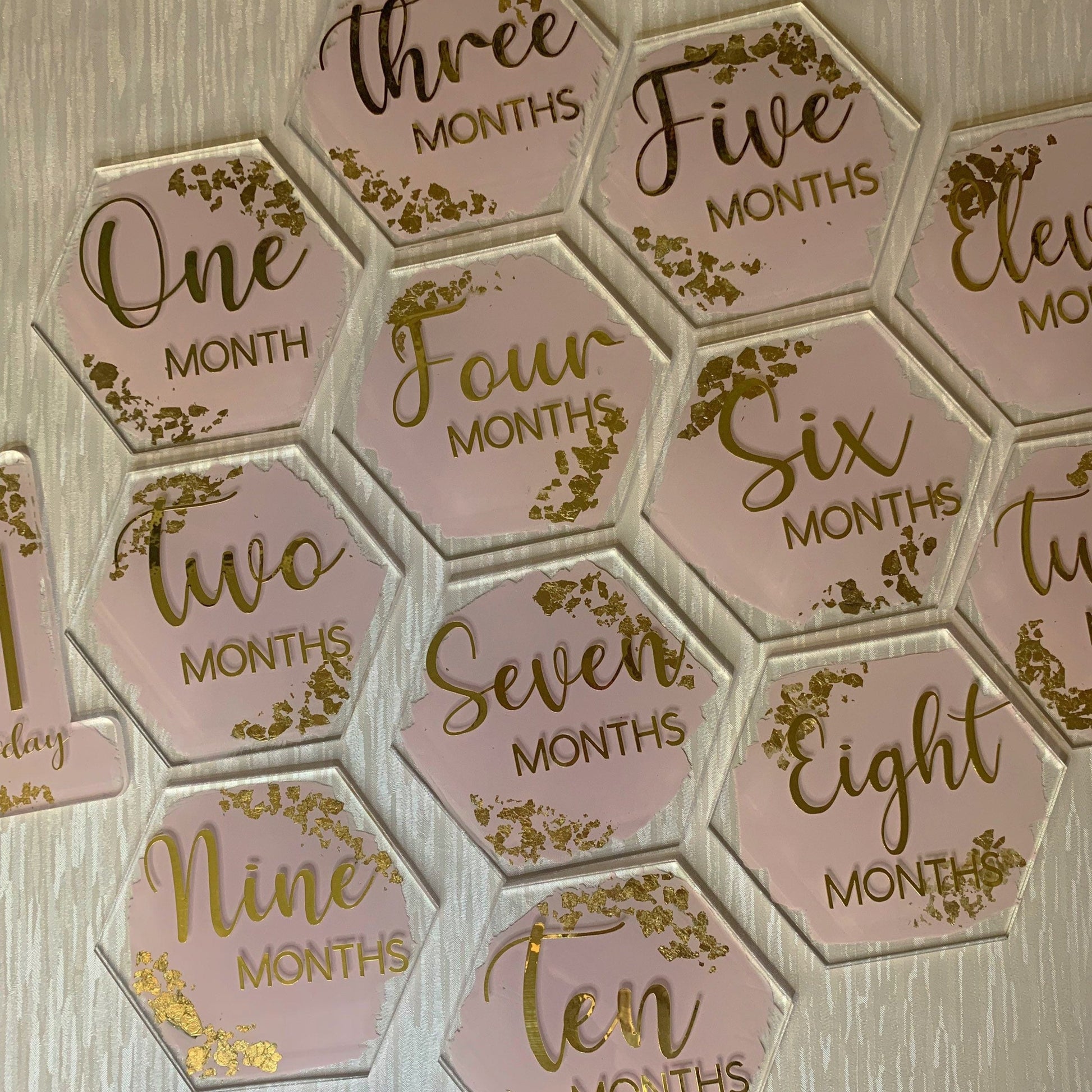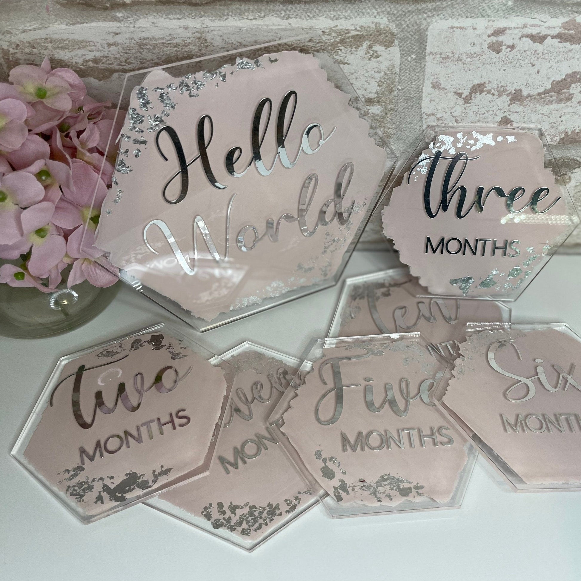 These acrylic hexagon milestone discs are designed for capturing your baby's first year, offering 13 photo props including "Hello World," months 1 through 12, and "Today I'm One." Ideal for documenting your newborn’s growth or as a thoughtful baby shower gift, each disc is hand-painted and can be personalised with your choice of font and paint colours. Please note that as handmade items, slight variations and colour differences due to lighting may occur. Remember, these discs are intended solely as photo props and are not toys. Allow up to two weeks for dispatch.