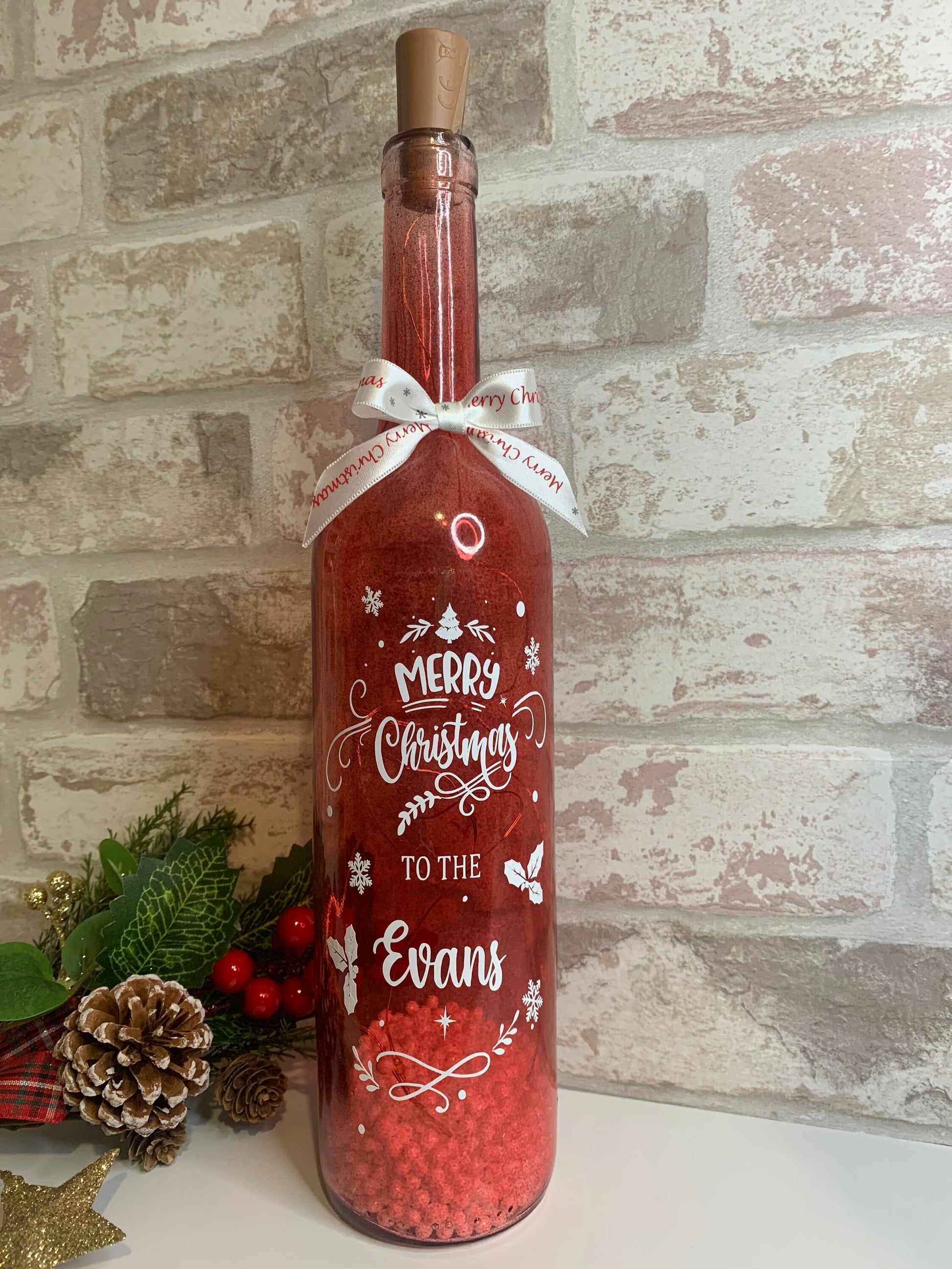 This personalised Merry Christmas light-up bottle features a full-sized glass bottle adorned with a coloured bow and fitted with a cork containing white fairy lights. Ideal as a thoughtful gift for friends, family, or neighbours, the light switch is conveniently positioned on the cork for easy operation. The bottle uses replaceable batteries (3 x LR44), which are included with UK orders. Each item is made to order, and custom designs can be accommodated when possible. Please note, batteries are not shipped outside the UK but are affordable and widely available online.