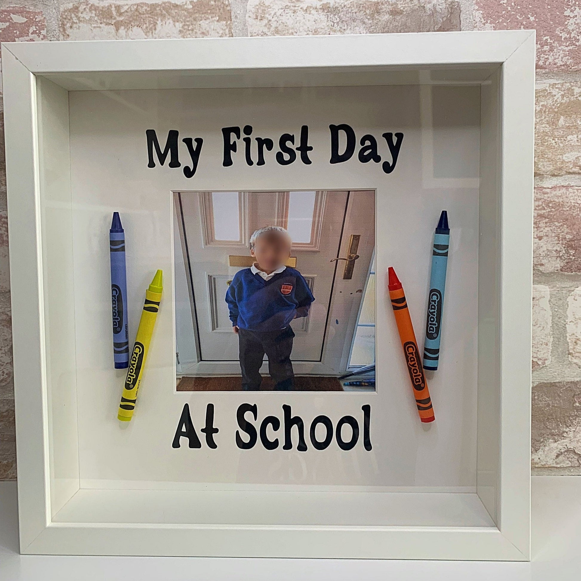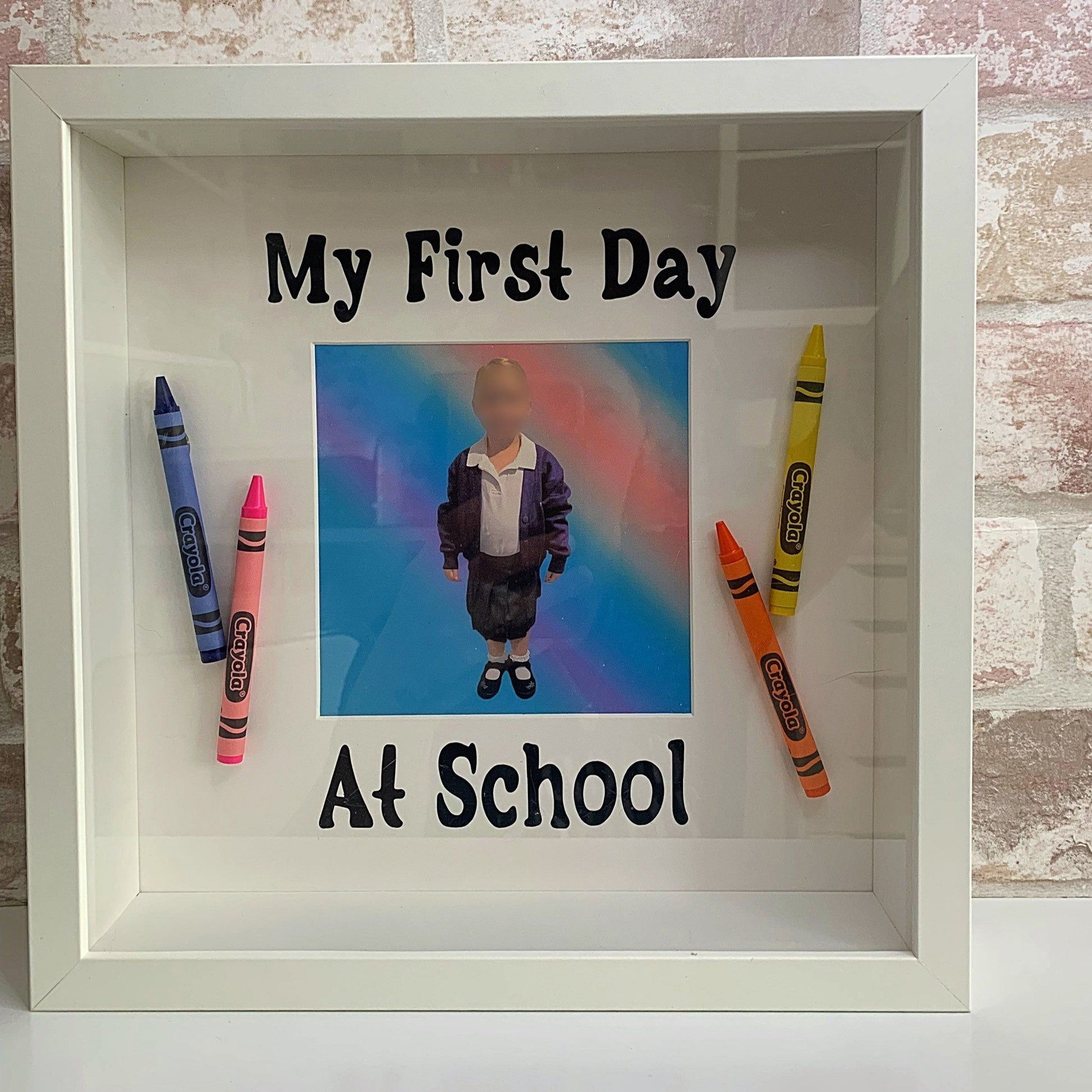 This handcrafted, personalised "My First Day at School" frame is an ideal gift that enhances any home décor. It serves as a meaningful keepsake to mark your child’s first day at school or nursery. Carefully designed to complement any room, these frames can be customised with your child’s name and date for a truly unique touch. Please include personalisation preferences and any wish for colour variations in the note to seller box at checkout. The artwork is presented in a 25cm x 25cm 3D white box frame with glass.