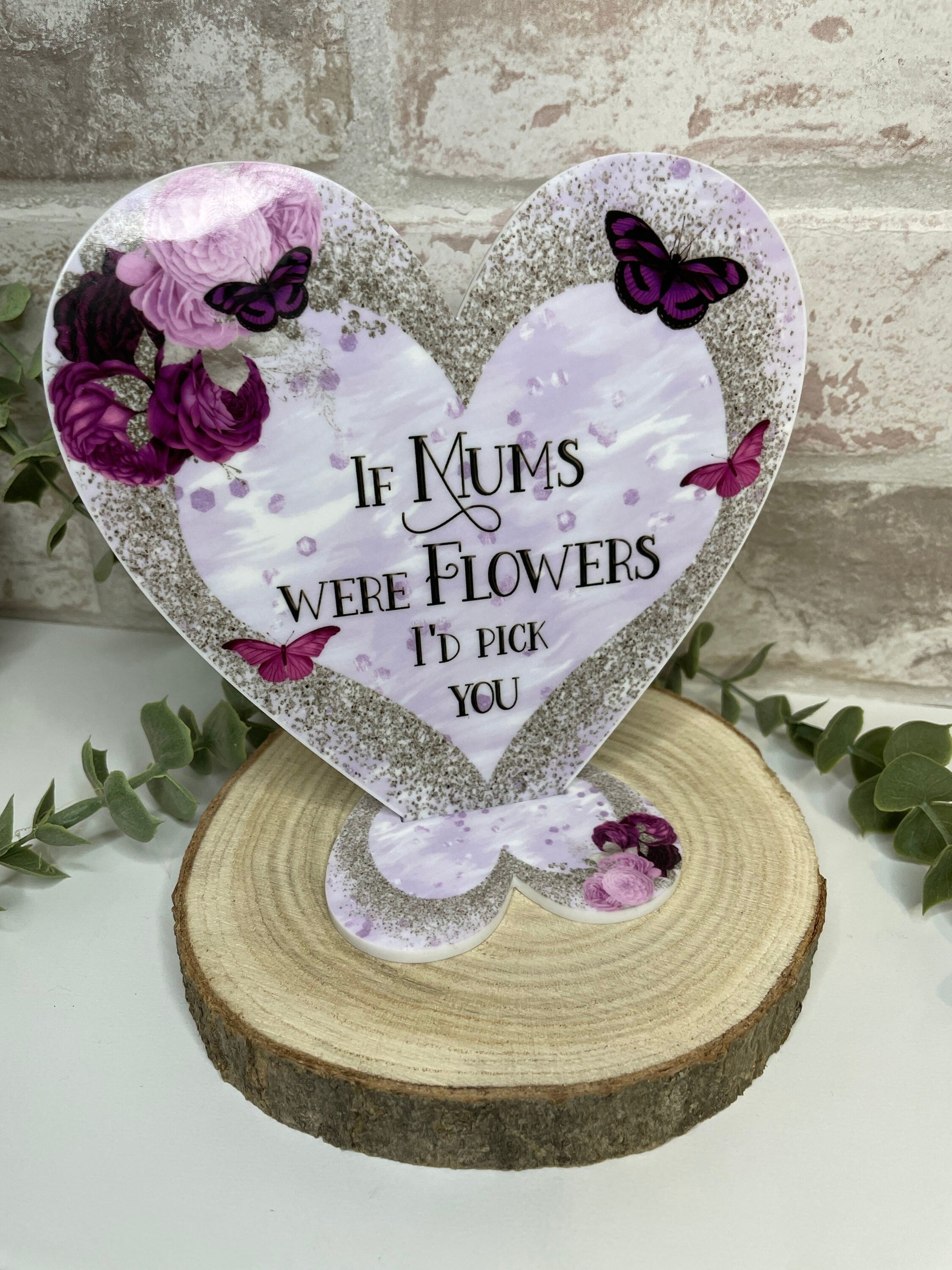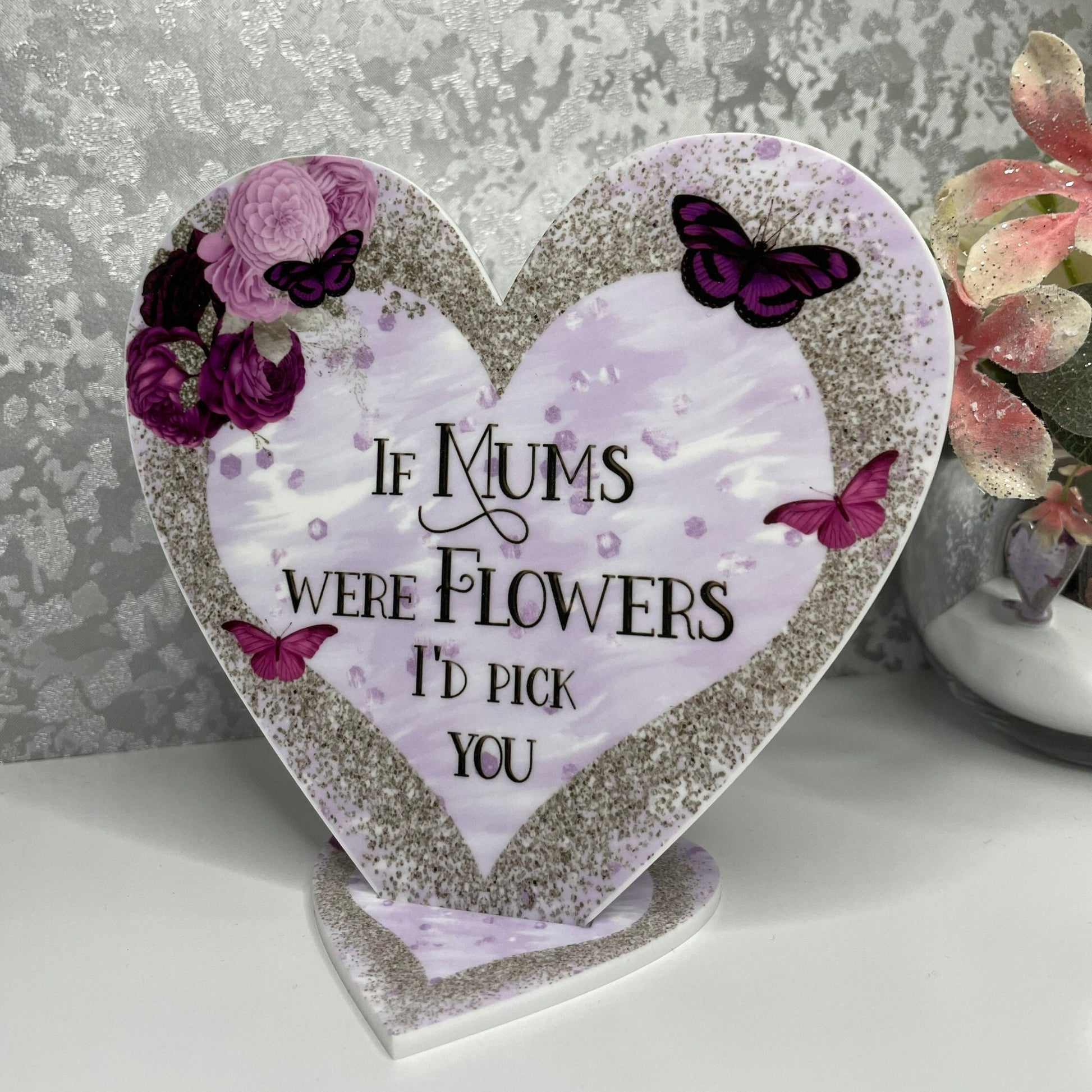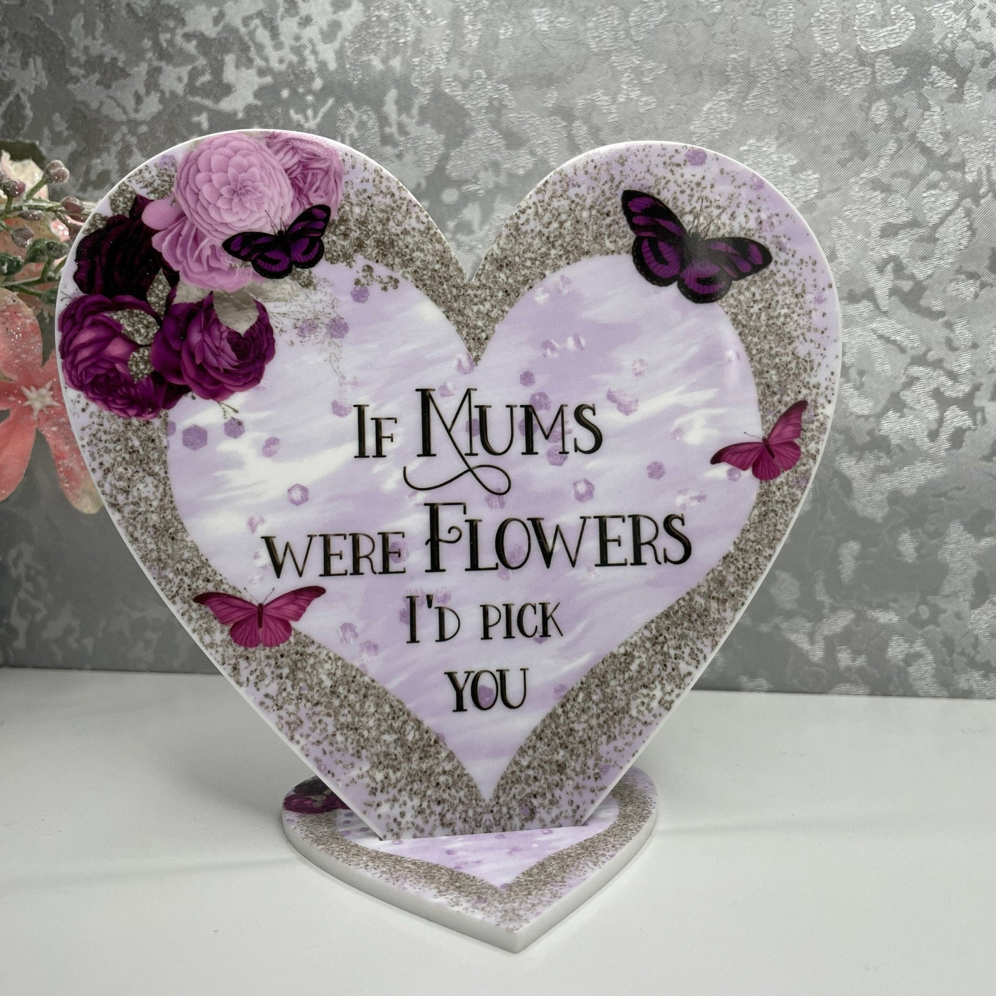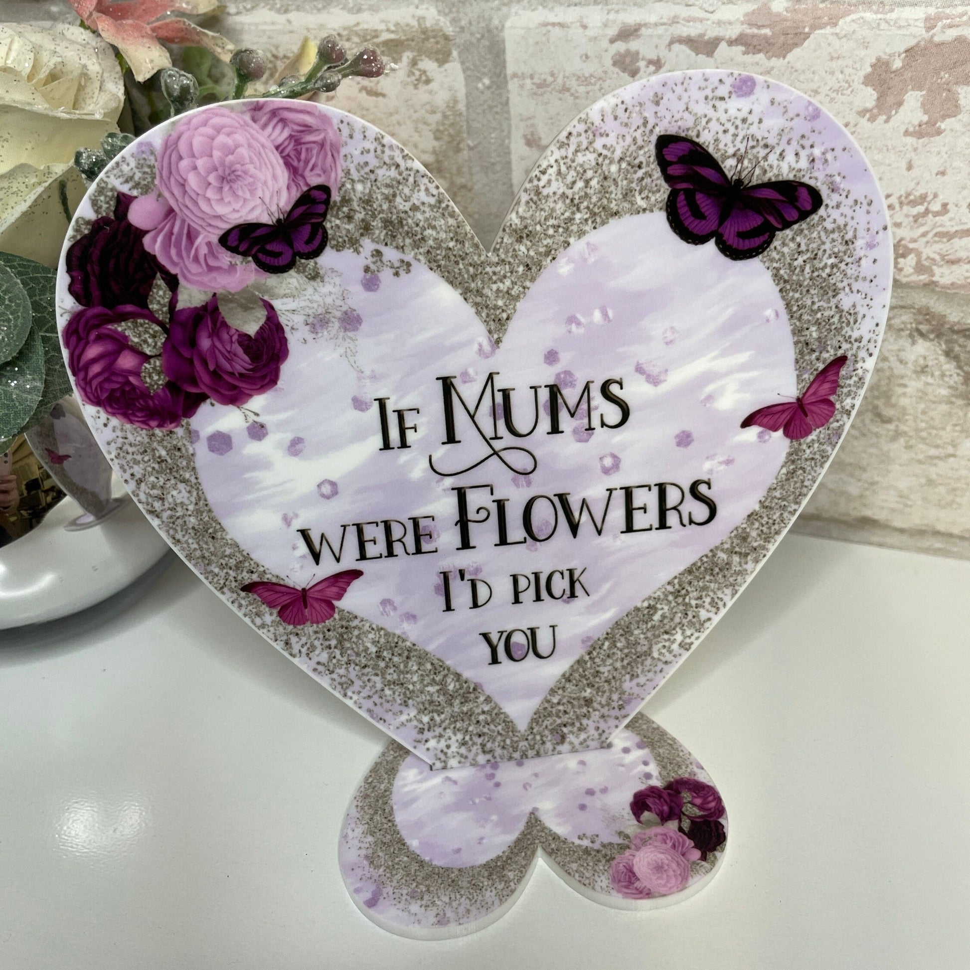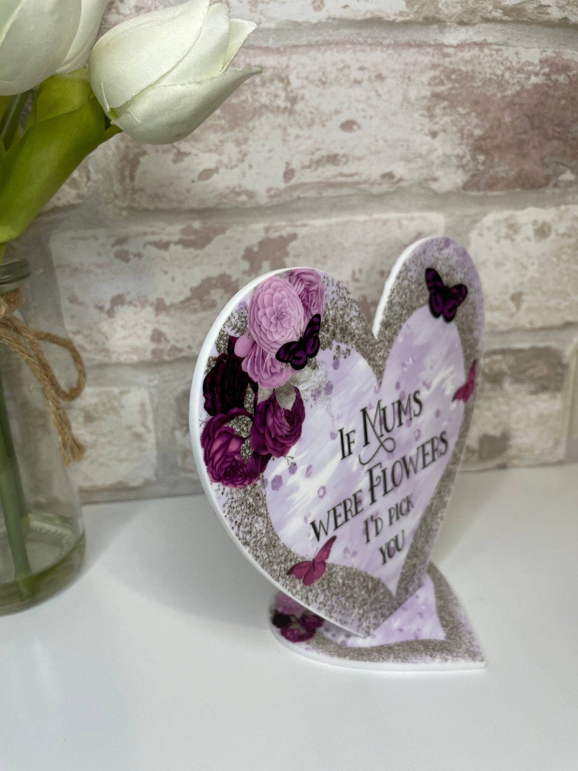 Discover the ideal gift for Mum with this elegant freestanding heart decoration. Featuring the heartfelt quote, *If Mums were flowers, I'd pick you*, this distinctive keepsake can be personalised to reflect your own message—simply provide your details at checkout. Printed in full colour on 3mm white acrylic using laser cutting, it offers a durable, vibrant finish. The heart measures 15cm by 13.4cm and includes a heart-shaped stand that assembles easily for a stable display. Perfect for Mother’s Day, this thoughtful gift from son or daughter will be treasured for years to come.