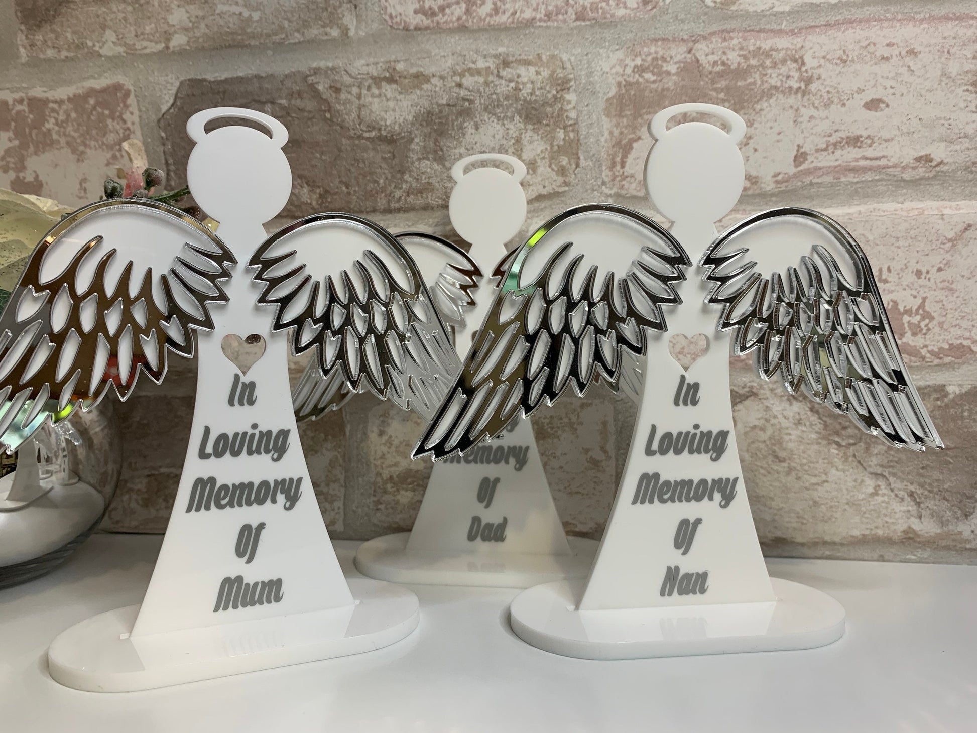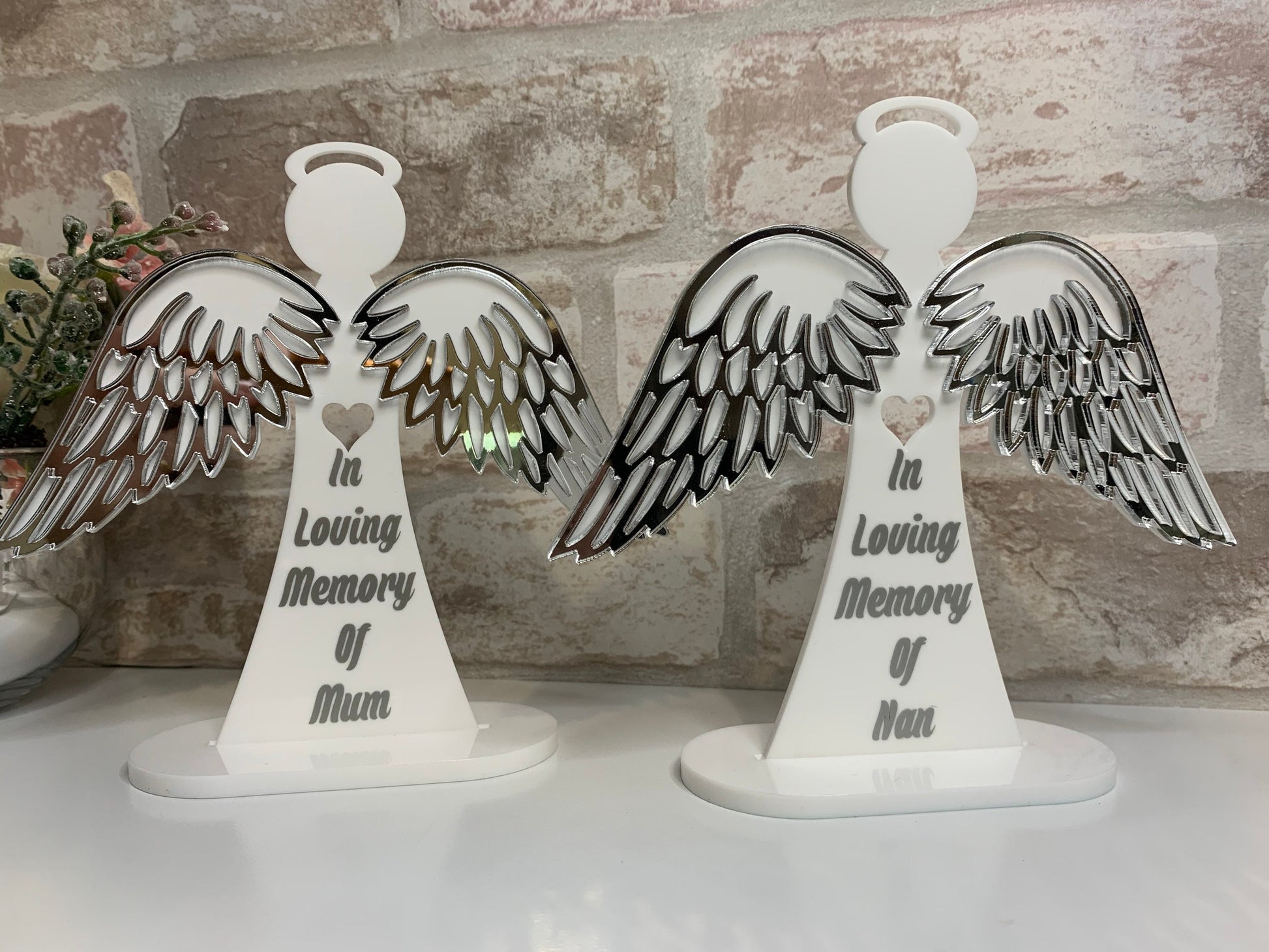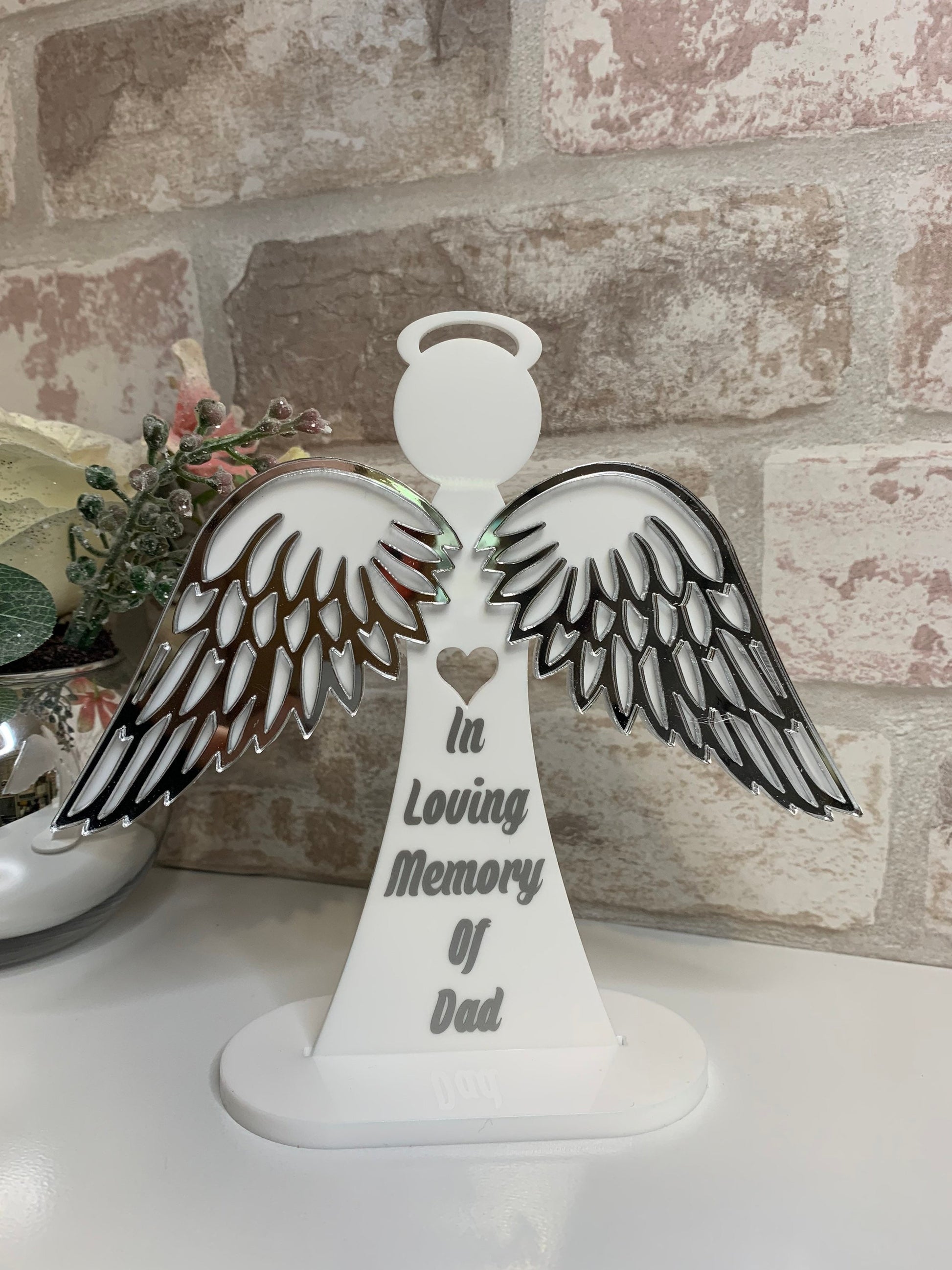 This exquisite freestanding Angel serves as a heartfelt keepsake in remembrance of a loved one. Featuring mirror chrome wings and a sturdy base, it can be personalized with any name, such as Mum, Dad, or Nan, as well as a memorial date or custom message. The default wording color is silver, but alternative colors can be requested at checkout. Measuring approximately 15cm by 16cm, this elegant Angel offers a meaningful tribute and a comforting gift for those cherishing memories of those no longer with us.