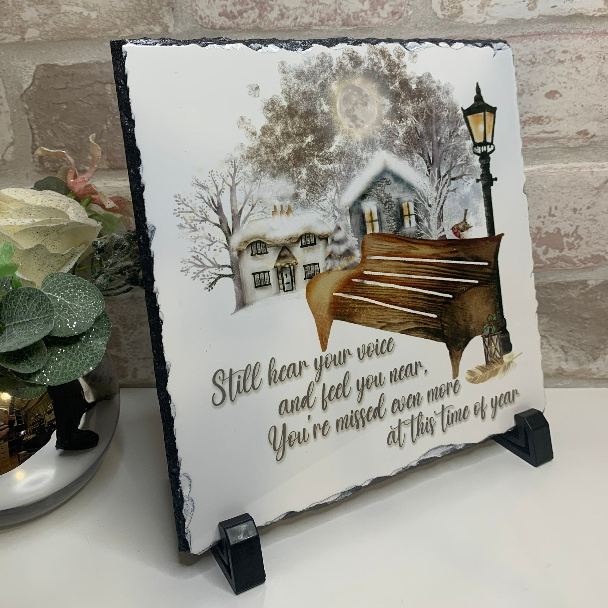 Offer a meaningful tribute with a memorial photo slate, designed to bring comfort and lasting memories. Our handcrafted slates come in two sizes: a 20 x 20cm medium slate featuring the quote, "Still hear your voice and feel you near. You're missed even more at this time of year," and a 30 x 30cm large slate with the words, "Moments become memories. Memories become treasured. I will always remember with a love that cannot be measured." Each natural slate is finished with a subtle gloss that highlights your photo beautifully. Complete with a stand, these durable slates suit both indoor display and outdoor graveside remembrance. Due to their handcrafted nature, each piece is unique with individual edges and slight natural variations.