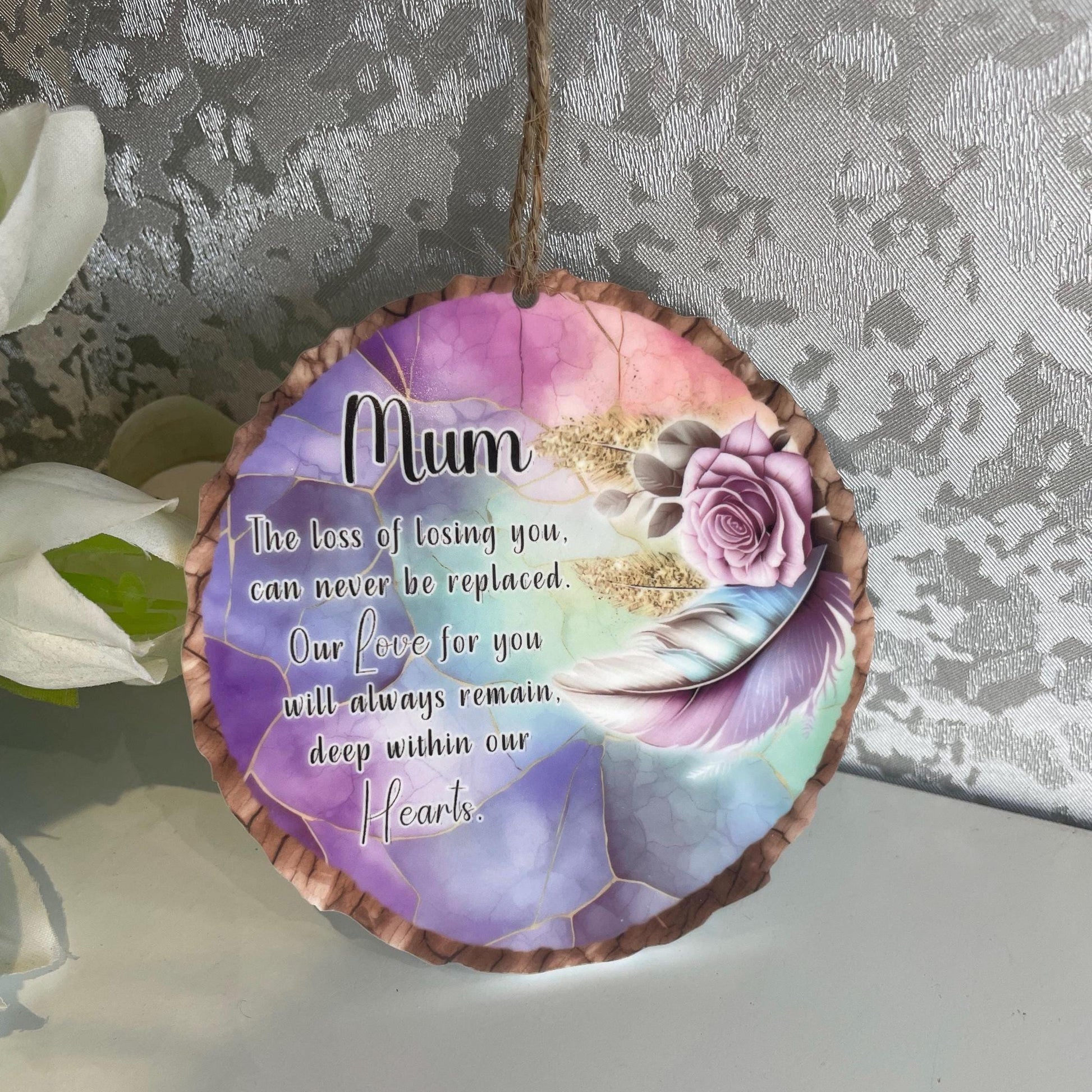 This elegant memorial log slice decoration features a heartfelt poem and comes in multiple design options. Personalise it with our poem and a name, or provide your own text to be expertly printed on durable acrylic for lasting quality. Ideal as a cherished keepsake to display in your home or hang on a Christmas tree, it offers a meaningful tribute. The poem reads: "The loss of losing you, can never be replaced. My Love for you will always remain, deep within my heart," with the option to change the final line to "OUR Hearts." Select your preferred design and personalise at checkout. Dimensions: 10cm x 10cm.