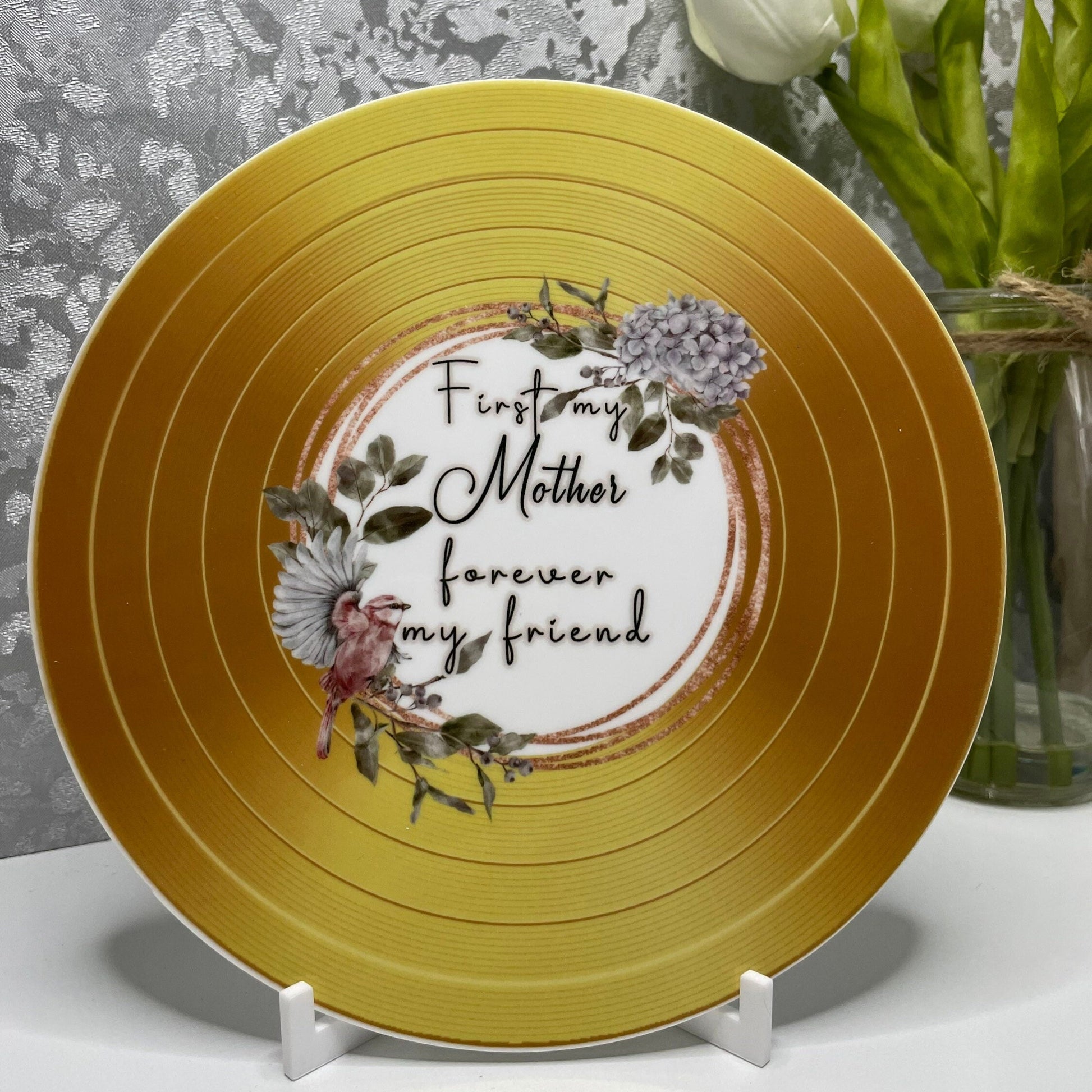 Celebrate Mother’s Day or special occasions with this beautifully crafted Vinyl Record Plaque, designed as a thoughtful gift for mums. Presented with a sturdy acrylic stand, it complements any room décor elegantly. Choose from two distinctive designs and multiple colours, each featuring one of these heartfelt quotes: “First my Mother, Forever my friend, or “If Mum’s were flowers, I’d pick you.” Printed in exceptional 1200dpi quality, the plaque measures 17.5 x 17.5 cm, capturing the classic vinyl record style with a modern touch.