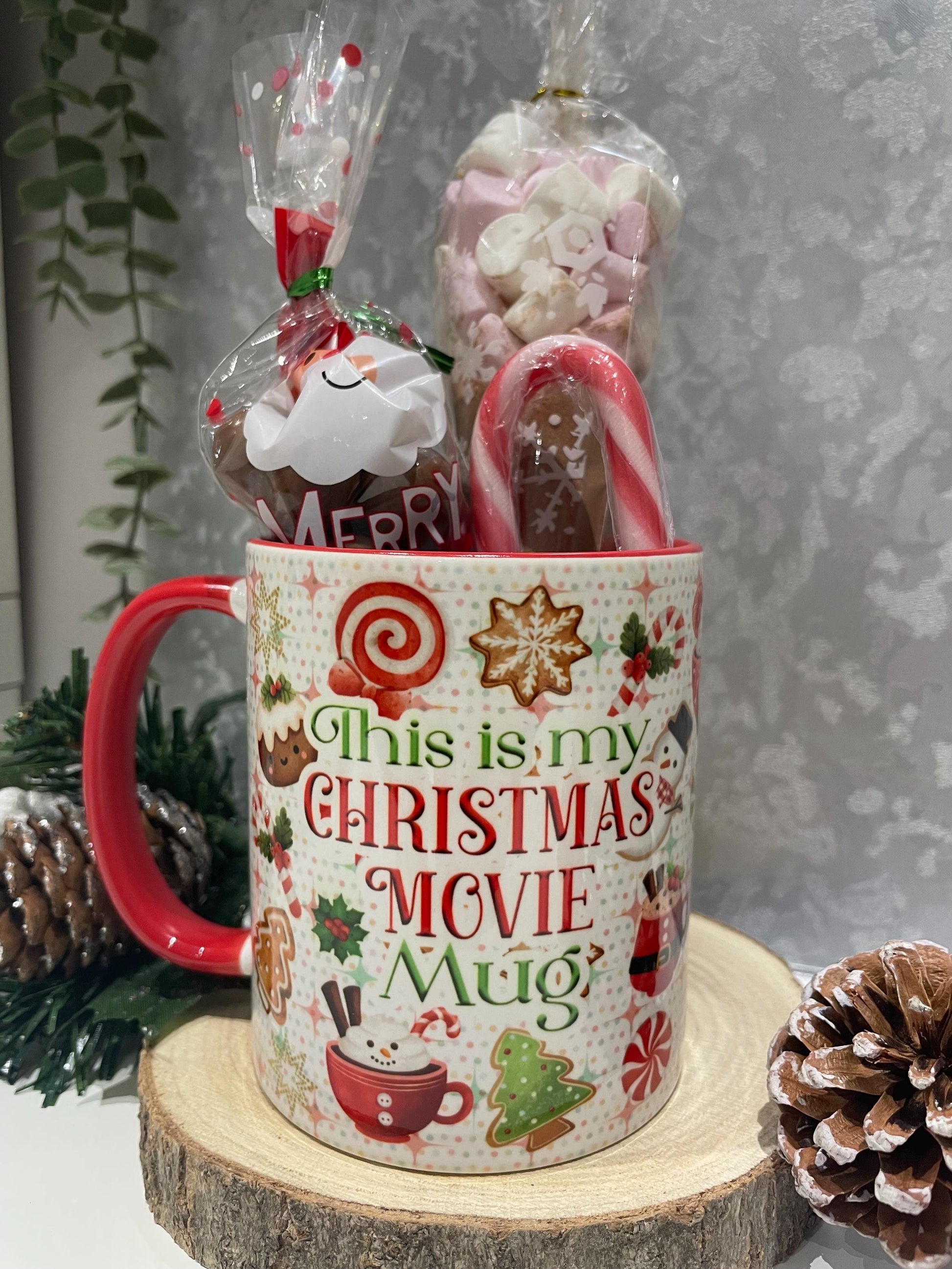 Enhance your Christmas celebrations with our personalised Christmas Movie Mug, designed to bring festive cheer. This elegant mug features charming Christmas-themed artwork and is inscribed with "THIS IS MY CHRISTMAS MOVIE MUG." The interior and handle are a rich red, complementing the classic 11oz white ceramic base. Customise it with a name or choose the standard design. Printed with premium ink and finished with a glossy sheen, it’s both dishwasher and microwave safe. Ideal as a thoughtful Christmas Eve box gift.
