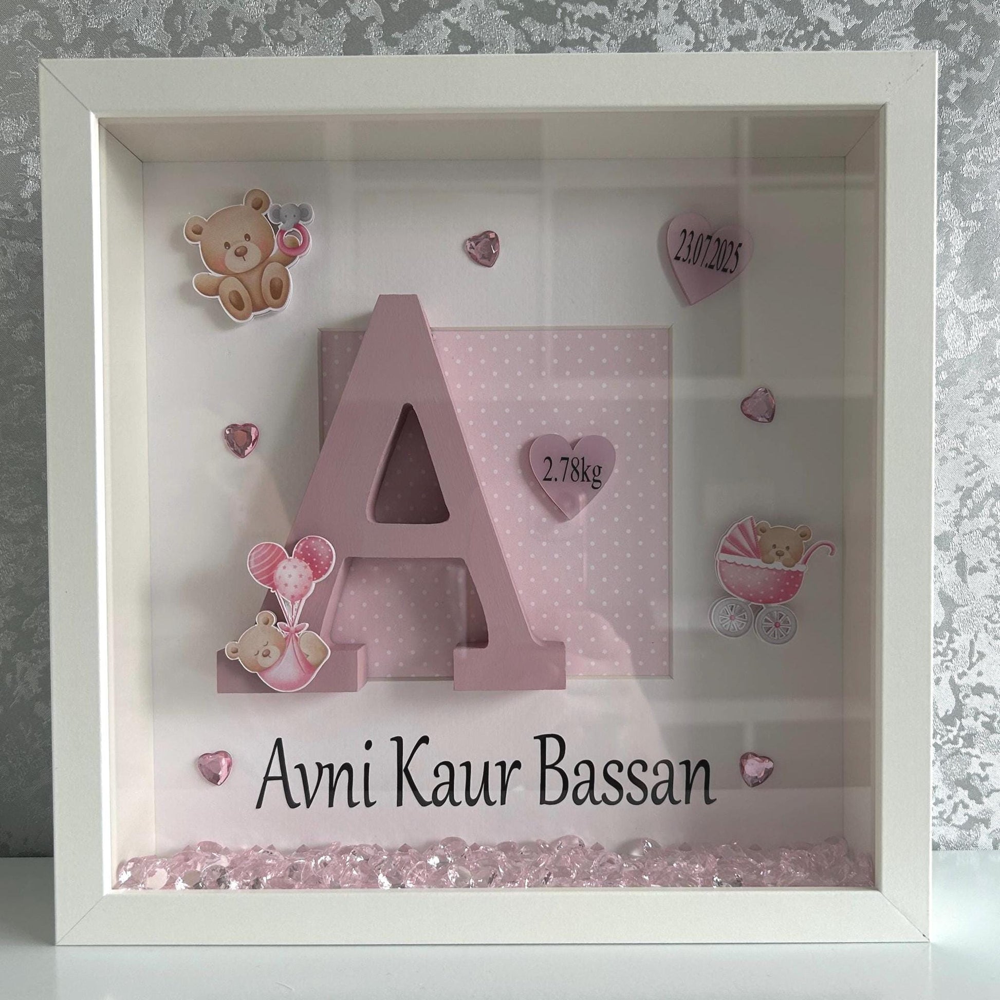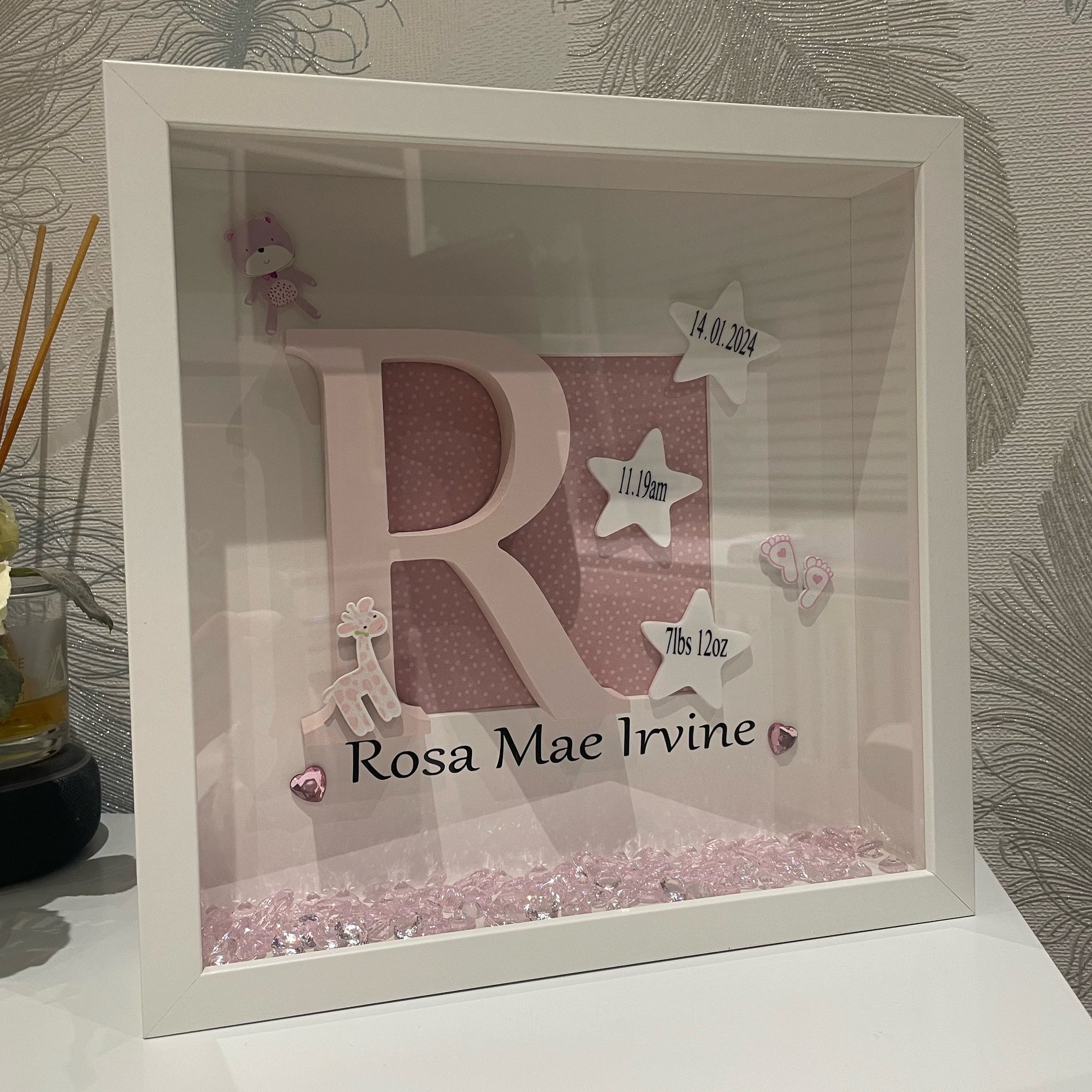 This handcrafted, personalized baby art frame is an ideal gift to commemorate a new arrival. It serves as a beautiful keepsake for a birth, christening, or birthday, featuring space to include the child's full name, date of birth, weight, and time. You can request additional details if desired. The design incorporates acrylic stars or hearts and balloons in assorted colors suited for boys or girls—select your preference at checkout. These frames add a charming touch to any nursery or room. Please note embellishments may vary with stock availability. The artwork is presented in a 25cm x 25cm 3D white box frame with glass.