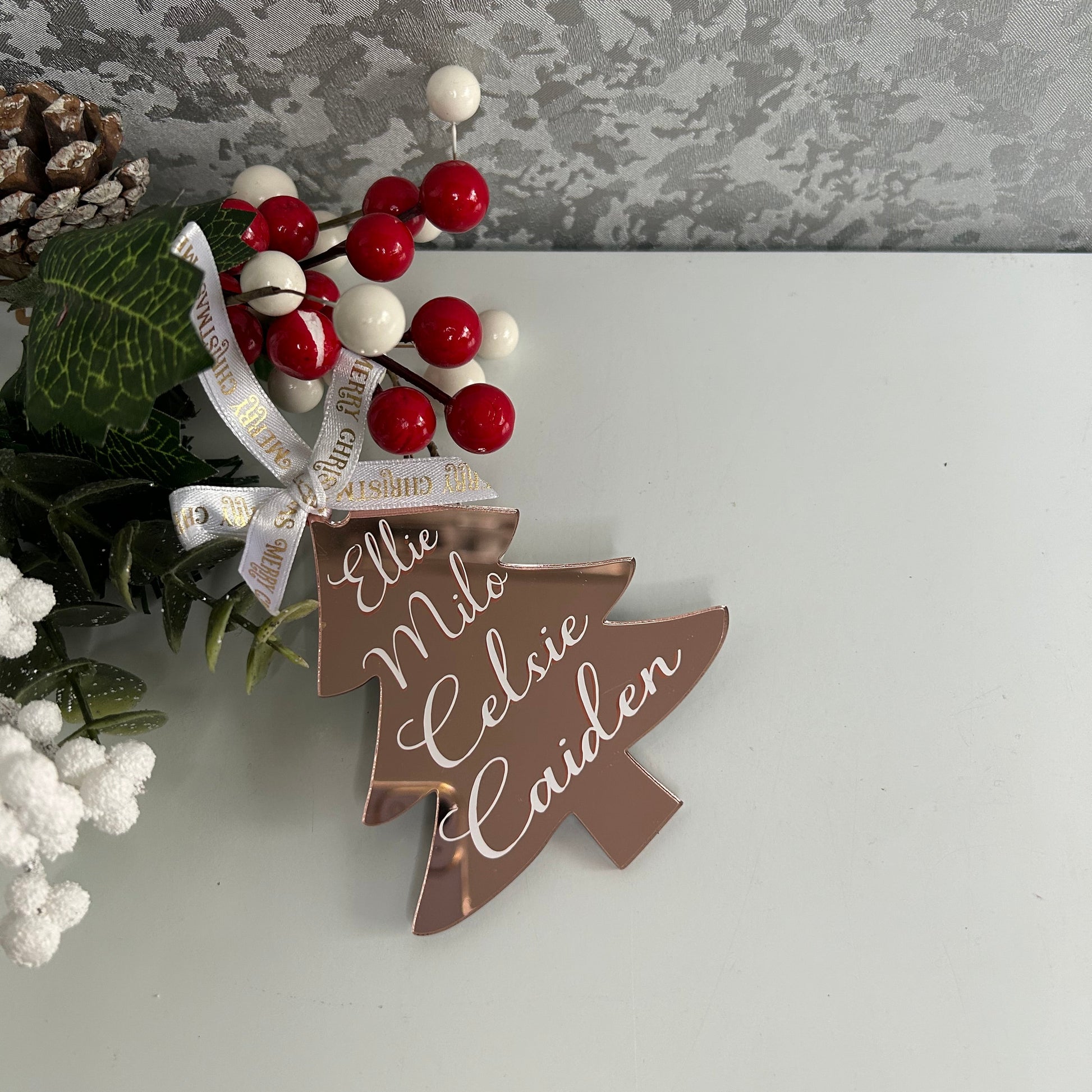 Personalised Christmas Tree Baubles bring a refined touch to your festive décor with options in rose gold or mirror chrome finishes. Crafted from durable acrylic, each bauble features a white vinyl print customized with names, “First Christmas,” or a personal message. Completed with a ribbon, these tree-shaped decorations are an elegant addition to your family tree or a thoughtful personalised gift. Choose from Mirror Rose Gold or Mirror Silver to best suit your holiday style.