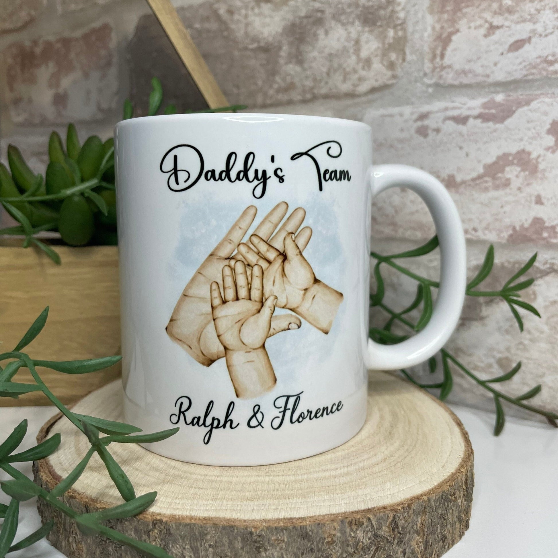 A custom Daddy's Team Mug designed especially for dads, making an ideal gift for birthdays or Father's Day. Choose up to six handprints, each personalized with children’s names, including options for rainbow and angel hands honouring lost baby angels. Crafted from white ceramic with a glossy finish, this 11oz mug is dishwasher safe for easy care. If you need to have multiple hand design please select upon checkout and leave all personalisation details in the box. For any special customization requests, please get in touch.