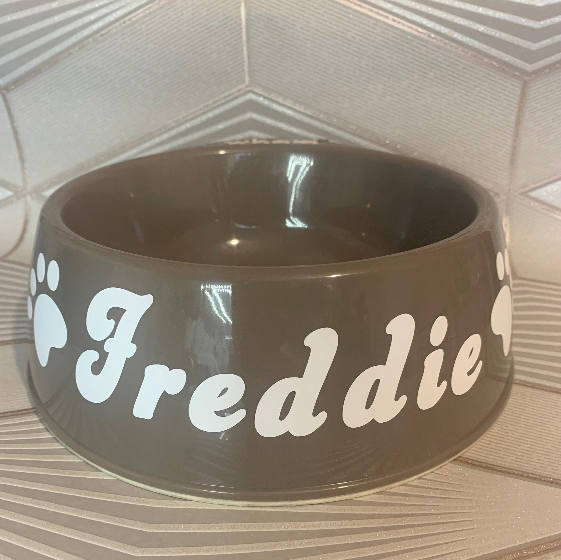 Customised Pet Bowls WHAT WHAM feature medium-sized round bowls available in four distinct colour options, designed to complement your pet’s style and your home décor. Each bowl is carefully made to order, ensuring a unique and personalised touch. You can choose from a variety of vinyl lettering colours to customise the bowl with your pet’s name or any preferred text, going beyond the standard colours shown in the images. These bowls combine practicality with a personalised design, making them a thoughtful and functional gift for any pet owner.