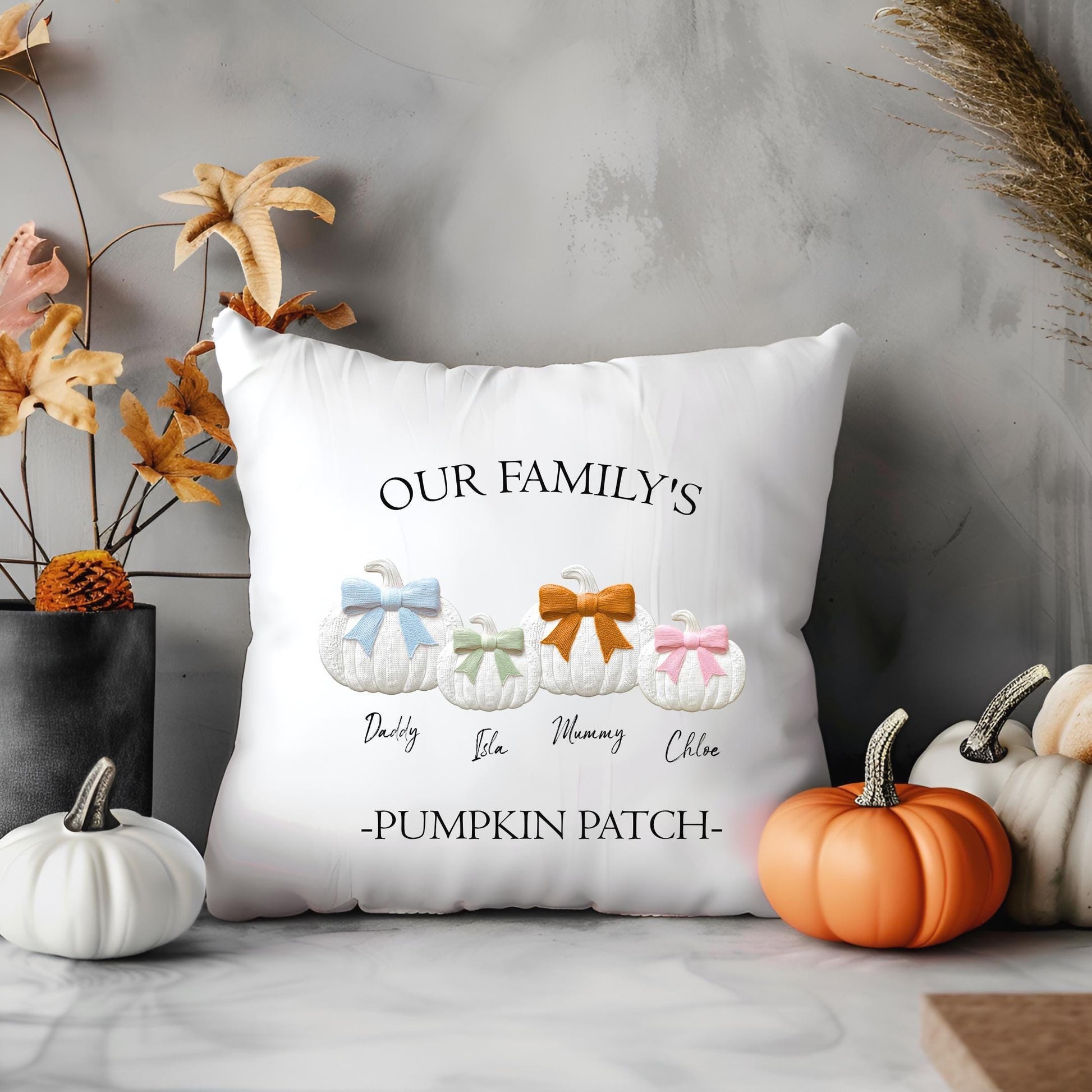This charming personalised pumpkin patch cushion is ideal for adding a warm, seasonal touch to your home this Autumn or Halloween. Customise it with any family surname or simply ‘Our Family.’ Select the number of pumpkins and names to represent your household. The design showcases embroidered-style pumpkins adorned with four differently coloured bows, with the option to include names beneath each pumpkin or leave them plain. Choose your preferred cushion size and pumpkin colours at checkout, and enter the names in the personalisation box. Made from 100% polyester, these 40cm x 40cm covers come with or without the inner and are machine washable at 40°C. Crafted from premium polyester blends or linen-like fabric, this keepsake piece makes a distinctive and lasting gift.