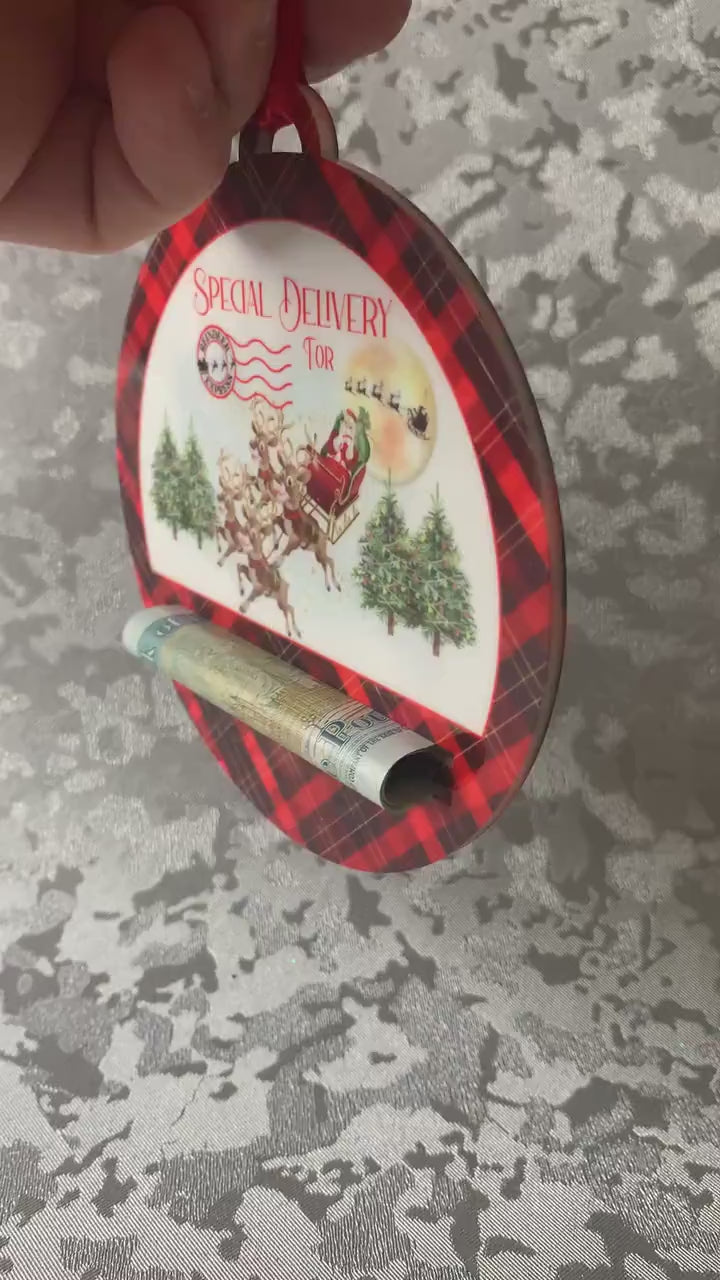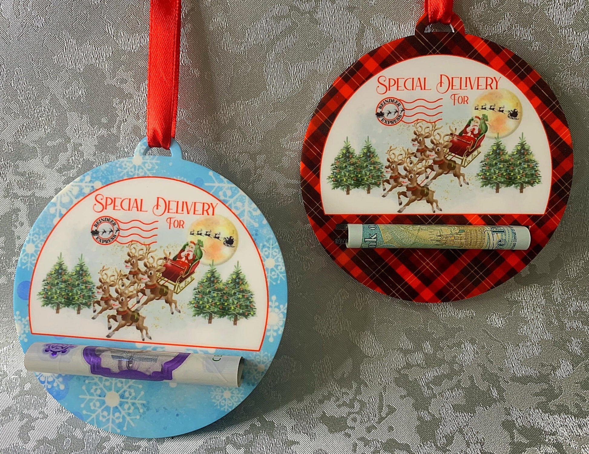 These circular Christmas bauble money tags offer a stylish and practical way to gift cash during the festive season. Designed to hold folded or rolled £5, £10, £20 notes, as well as euro notes, they make giving money simple and elegant. Available in six distinctive designs, each can be personalised with a "from..." message at the bottom—just add your details in the personalisation box at checkout. This versatile gift serves as a unique alternative to traditional Christmas cards or as a decorative ornament for the tree. Measuring 11cm x 10cm, the vibrant full-colour print is applied directly onto durable acrylic. Please note, money is not included.