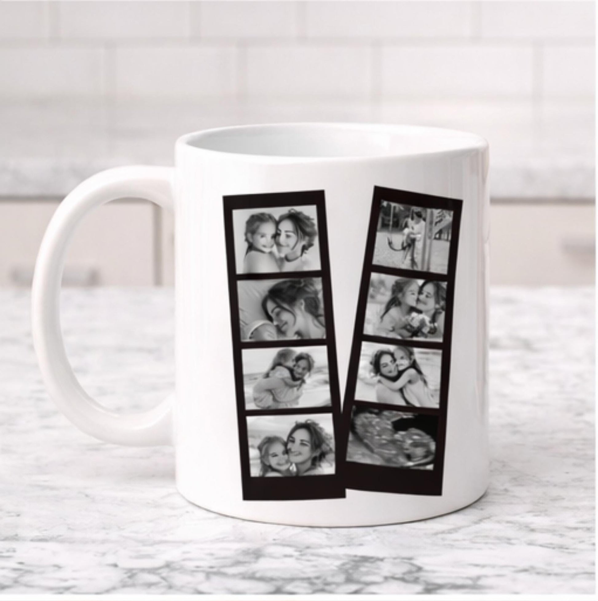 Celebrate the special bond between mother and child with this elegant personalised photo mug. Featuring a sophisticated black and white photo strip design, this 11oz ceramic keepsake transforms your cherished memories into a functional work of art. Each mug is custom-created with 6–8 of your finest photographs arranged in a signature photo booth style, complemented by optional personalised wording to make it uniquely hers. Crafted from premium white ceramic with high-quality sublimation printing, this mug withstands daily use—dishwasher and microwave safe with a beautiful gloss finish. Whether it's for Mother's Day, a milestone birthday, or simply to show appreciation, this timeless gift offers something far more enduring than traditional presents. She'll treasure it with every morning coffee or afternoon tea, enjoying a daily reminder of your shared moments together. Available with single or double-sided printing to suit your preference.