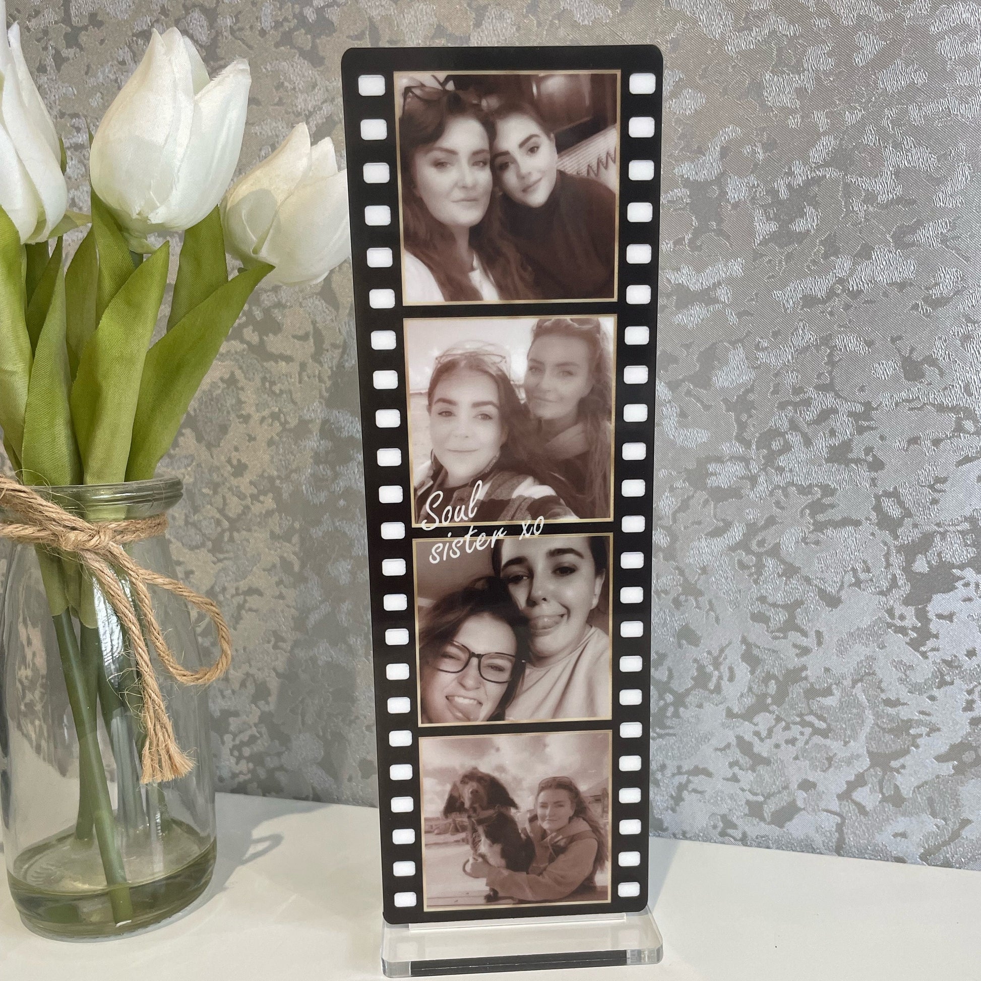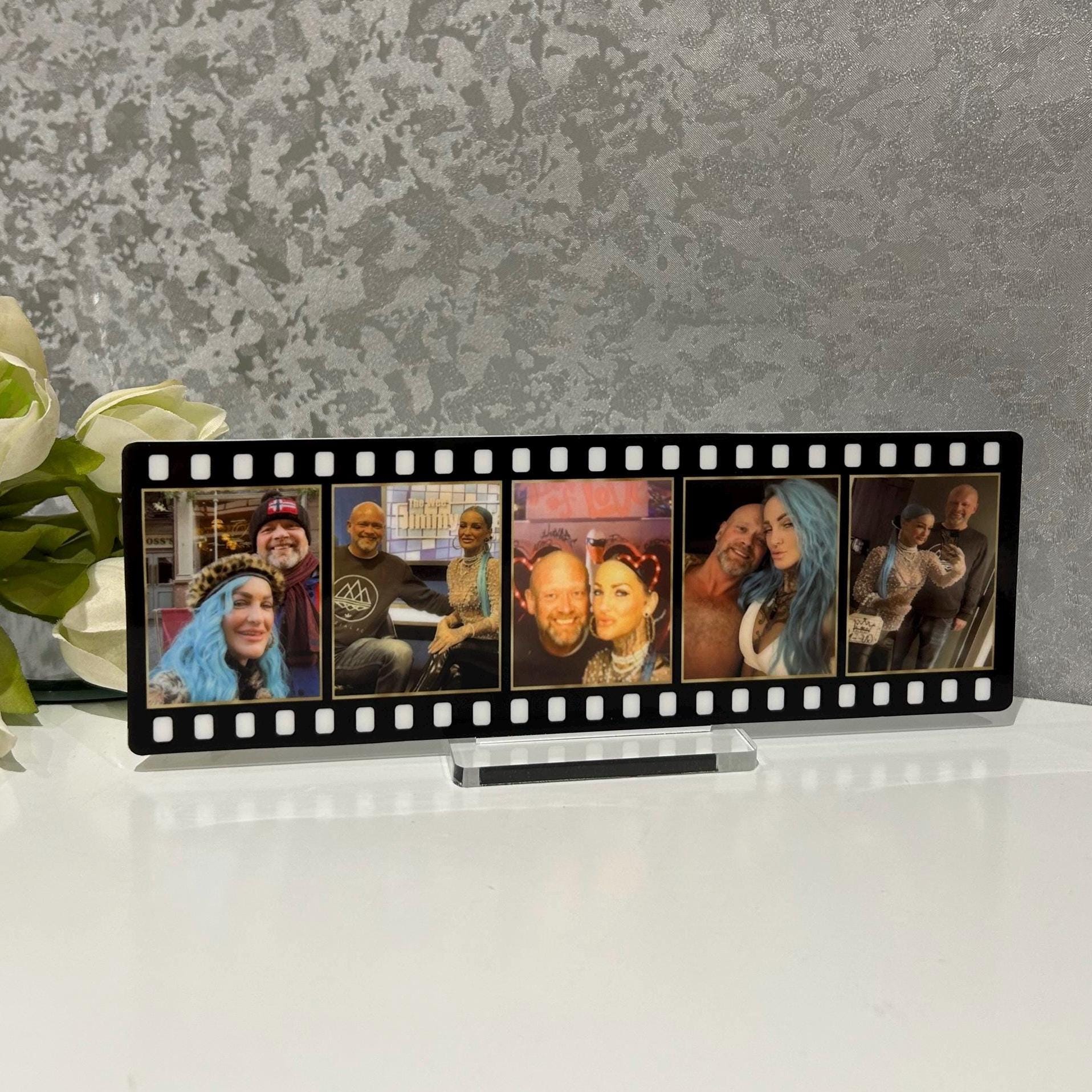 This personalized photo film strip comes with a clear acrylic stand, allowing you to display your favourite images elegantly. Select from three plaque sizes accommodating 3, 4, or 5 photos, and choose between black or white film strip colours. You can submit photos in colour or black and white, and optionally replace one photo space with a custom message by providing details at checkout or via message. Ideal for occasions like Valentine’s Day, weddings, or anniversaries, this durable acrylic plaque measures 7.5cm by 22.5cm and offers a distinctive way to showcase memories, perfect for both home and office settings.