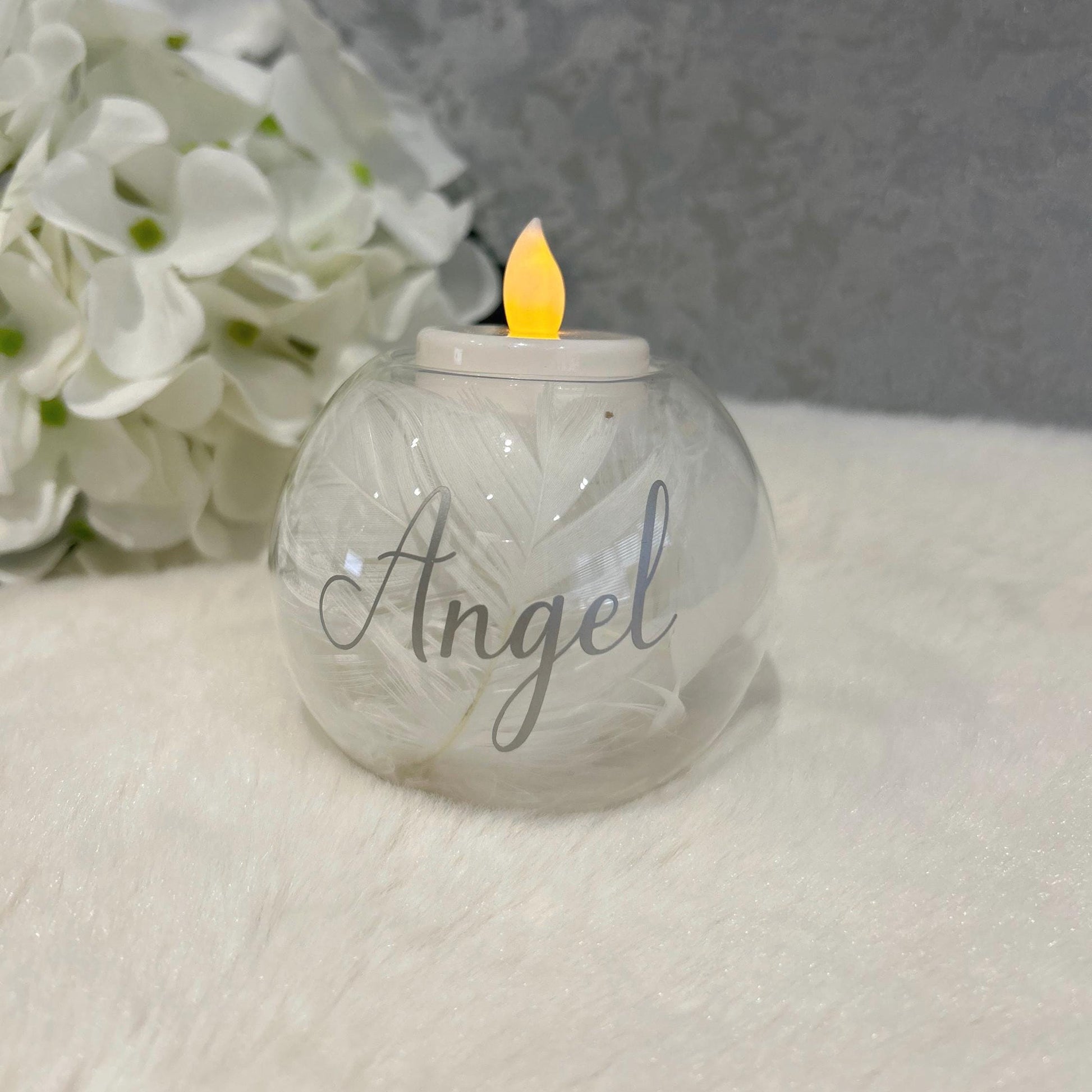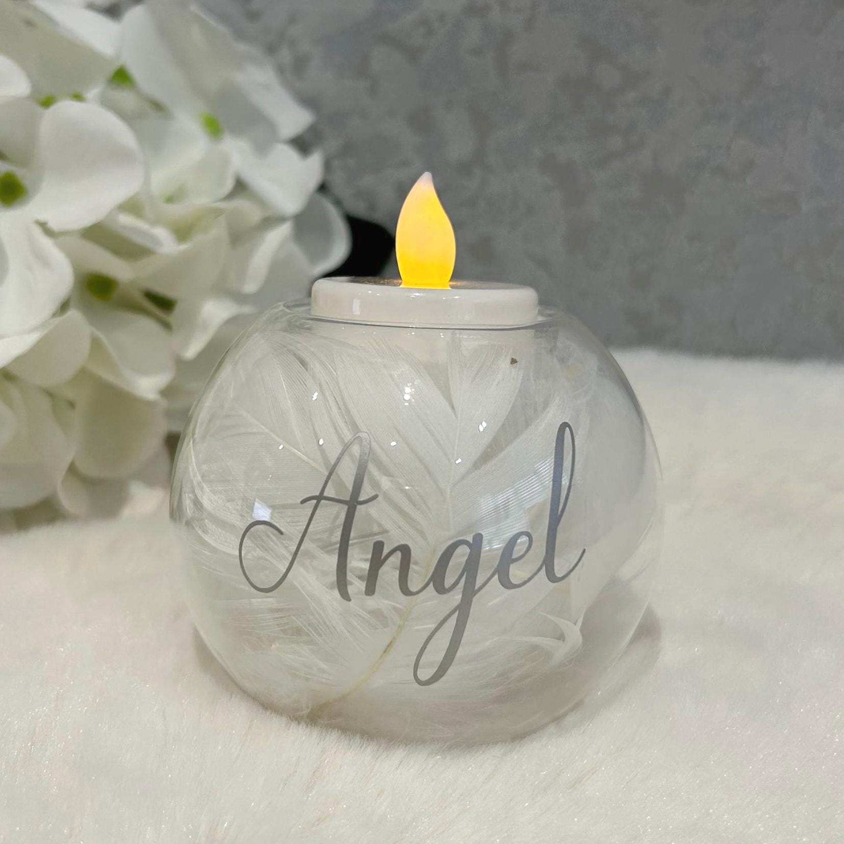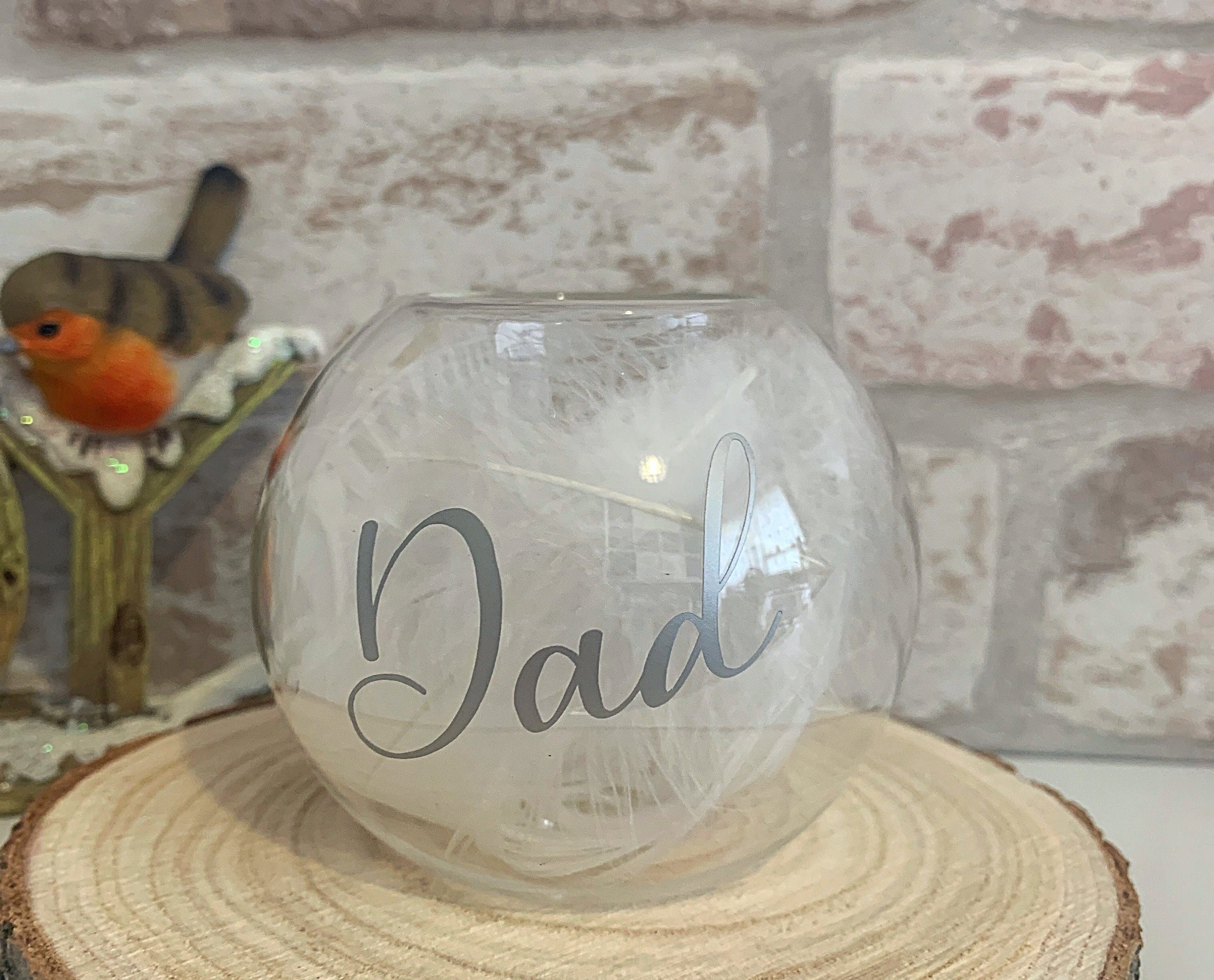 This personalised glass tealight holder contains delicate white feathers as a memory keepsake, offering a heartfelt tribute to a loved one. The front can be custom engraved with a name in silver or rose gold lettering, creating a meaningful memorial ornament. Ideal as a bereavement gift or a sensitive alternative to flowers, it serves as a comforting reminder on anniversaries or during times of remembrance. Custom text colours are available upon request, ensuring a truly personal tribute.