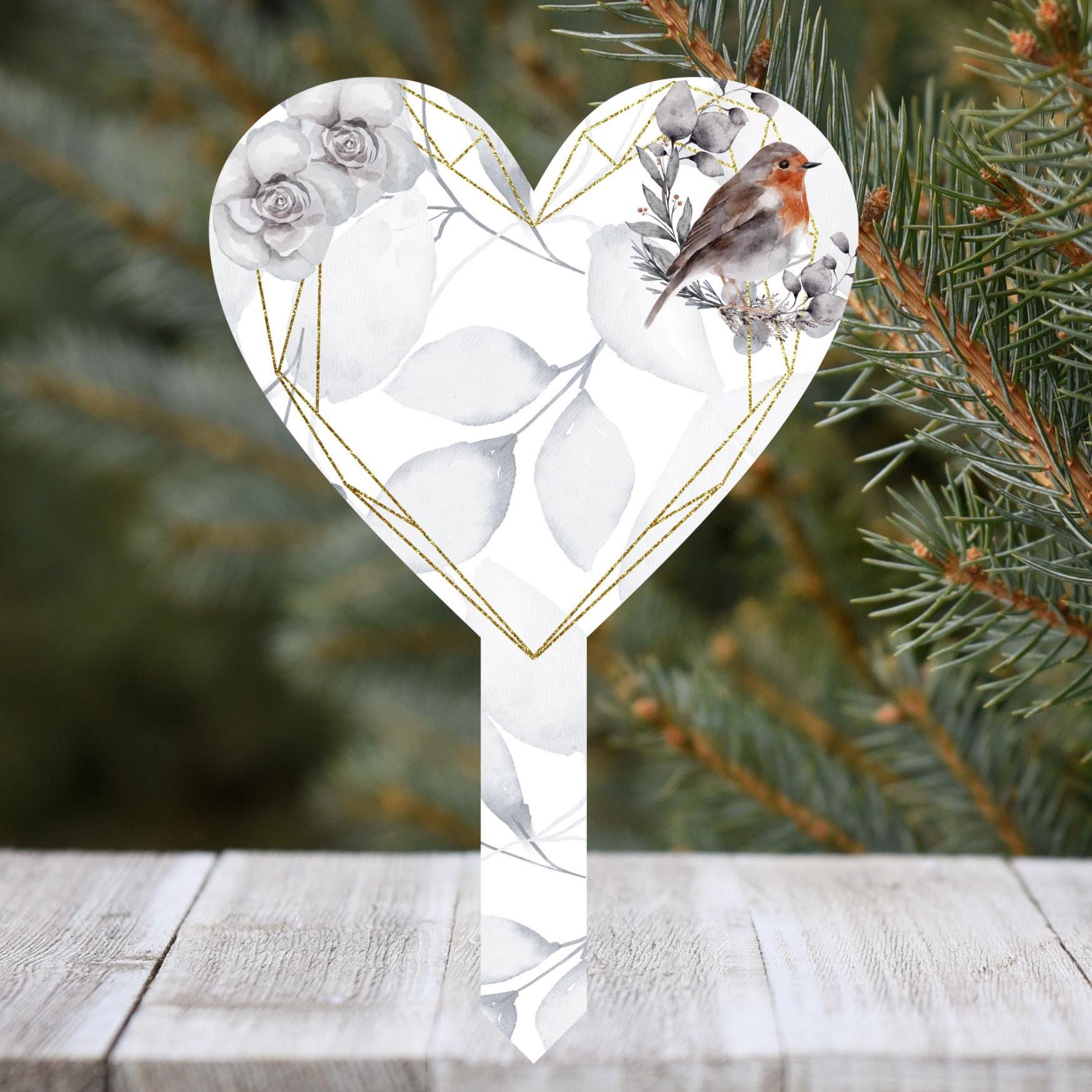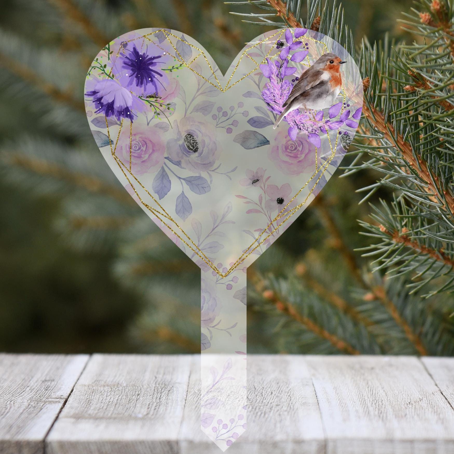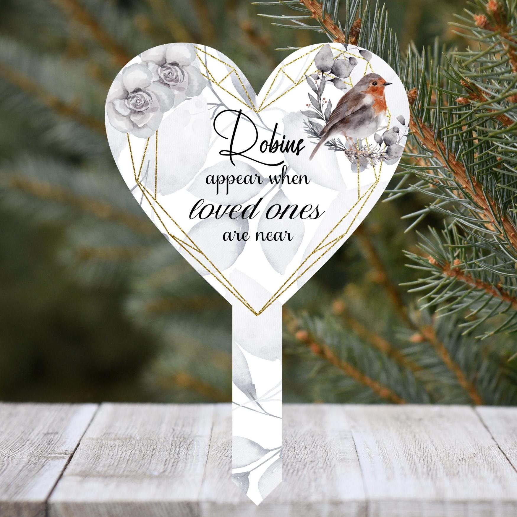 This beautiful heart-shaped memorial grave marker offers a heartfelt tribute to your loved ones. Featuring a white base with an elegant floral robin design in Purple or Grey, it displays the sentiment "Robins appear when loved ones are near." You can customize the text with your own message by providing details in the personalization box at checkout. Made with high-quality sublimated printing, the marker is designed to endure without fading. Ideal for gravesides, gardens, or tree planting, this acrylic memorial measures approximately 29cm by 19cm, providing a lasting and meaningful remembrance.