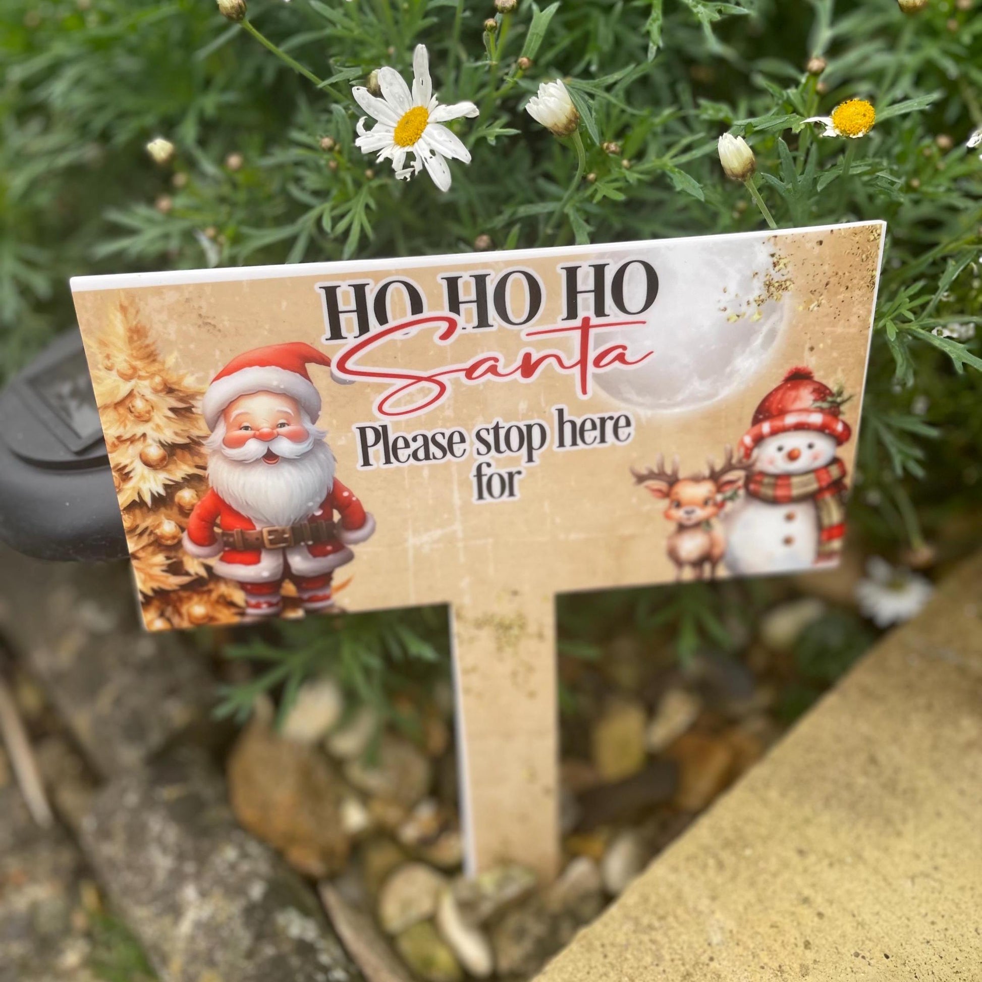 Invite a touch of festive enchantment with this personalised "Ho Ho Ho Santa Please Stop Here For" stake. Custom-made with up to four individual names or a family surname, these high-quality sublimated signs are designed to withstand outdoor use, guiding Santa and his reindeer to your home on Christmas Eve. Measuring approximately 19.5cm by 23.5cm, they provide a durable and charming way to delight children and enhance holiday traditions year after year.