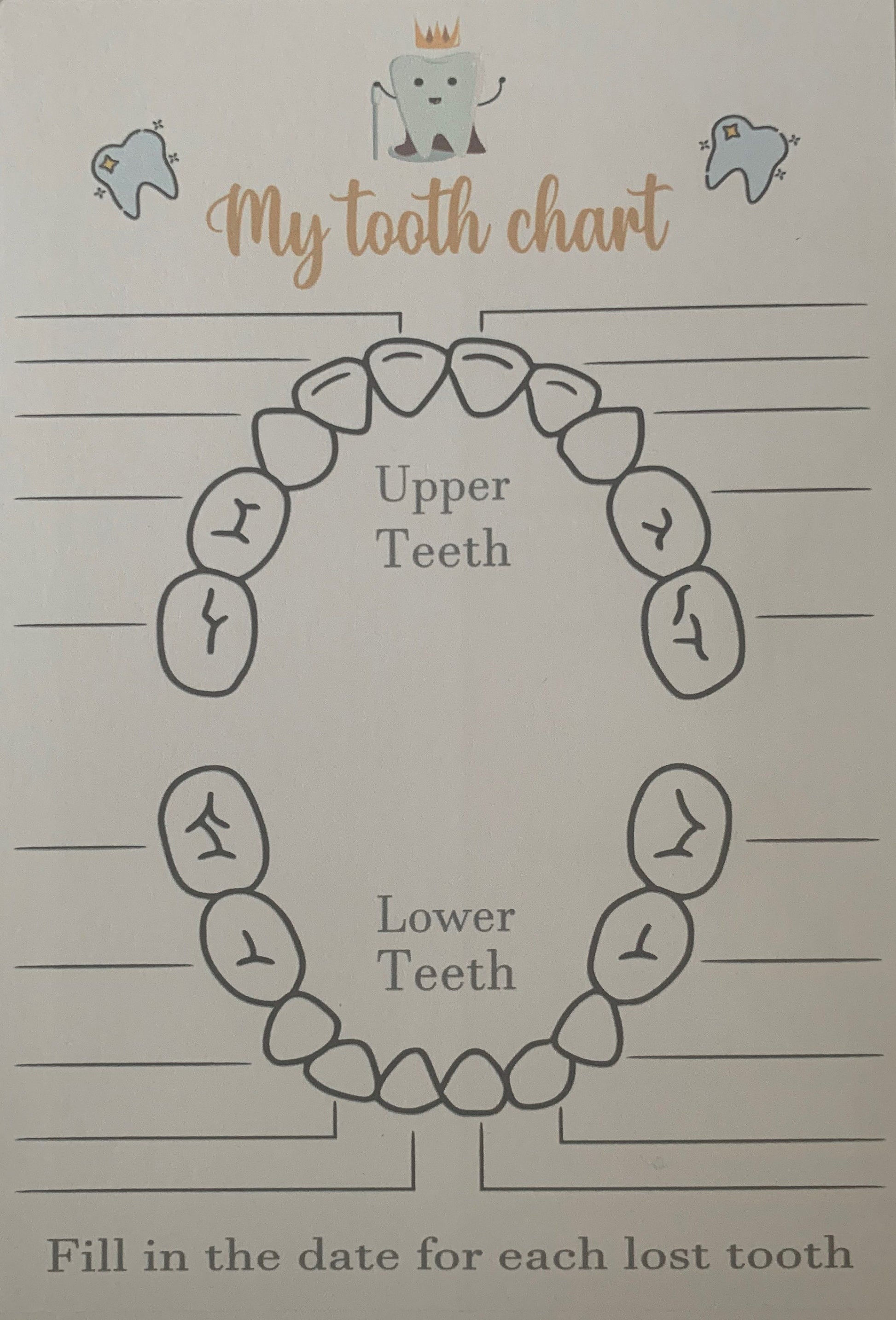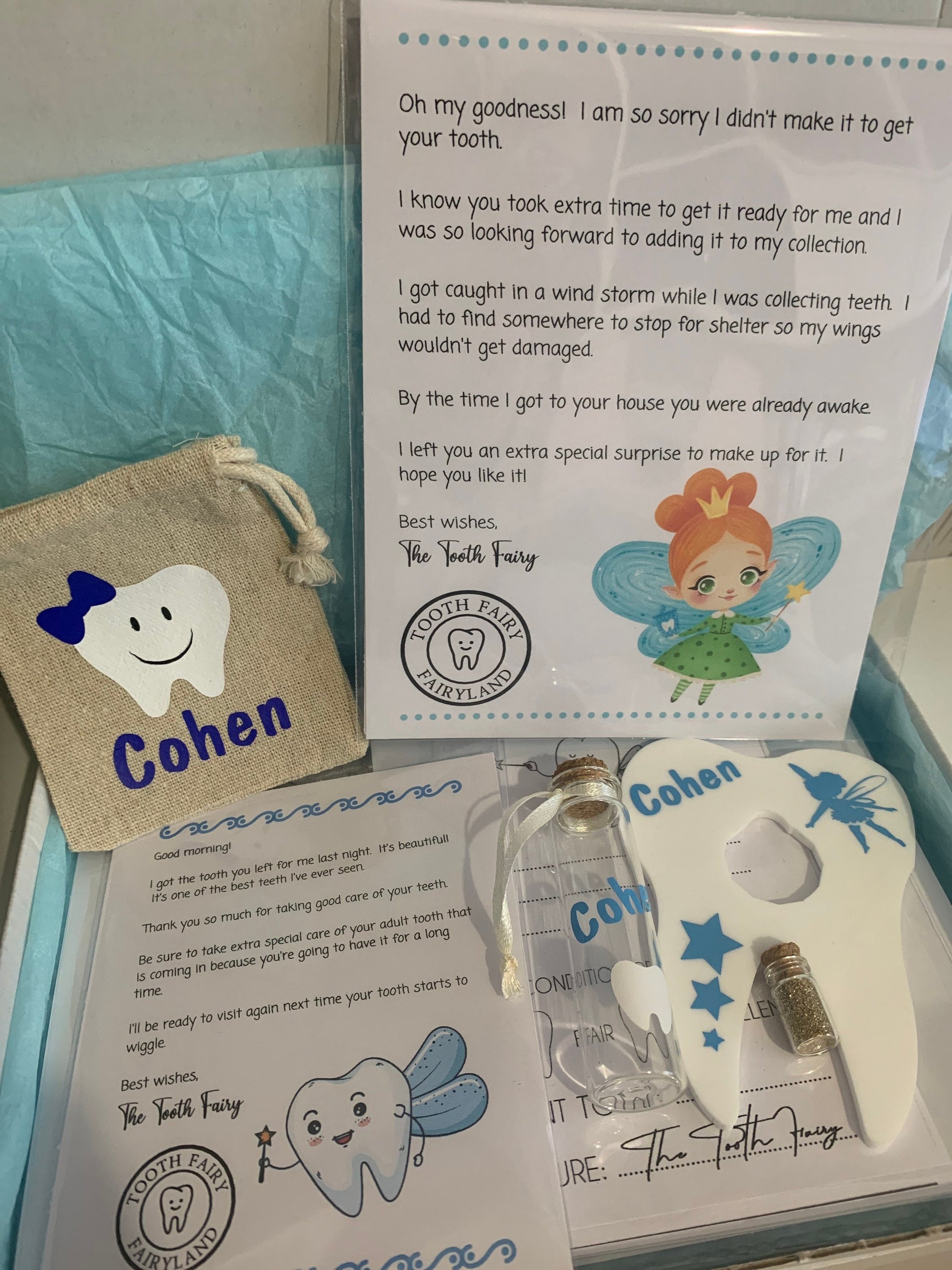 This exquisite handmade Tooth Fairy Keepsake Box offers a charming way to store your child’s first lost tooth or replace it with a gold coin from the tooth fairy. The set includes a jar of glitter fairy dust, a tooth-shaped coin holder, a tooth tube for safely keeping lost teeth, and a personalized tooth bag for storage. It also features a tooth chart, five tooth receipt cards, a letter from the Tooth Fairy, an apology letter for parents who might forget, a lost first tooth letter, and a fun colouring sheet for children.