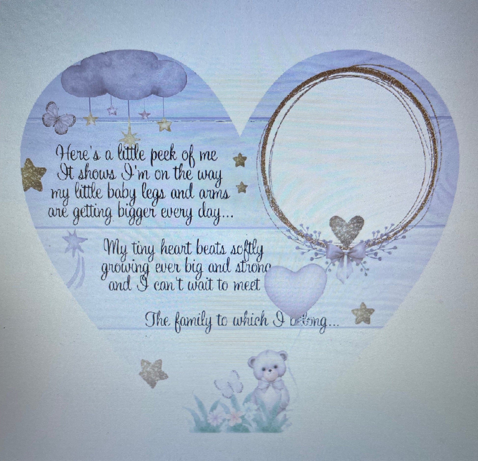 Our Customisable Freestanding Baby Scan Photo Heart Acrylic Plaque creates a memorable keepsake for expectant parents, grandparents, and family members. Celebrate the moment you discovered your journey to parenthood with this heartfelt piece. Ideal as a pregnancy announcement, baby shower gift, or nursery decoration, this elegant heart-shaped plaque comes with a stand and two design options: Teddy Bear in blue, pink, or neutral, and Elephant in blue or pink. Each plaque is personalized with a photo, name, and meaningful quote, making it a treasured memento of your new arrival.